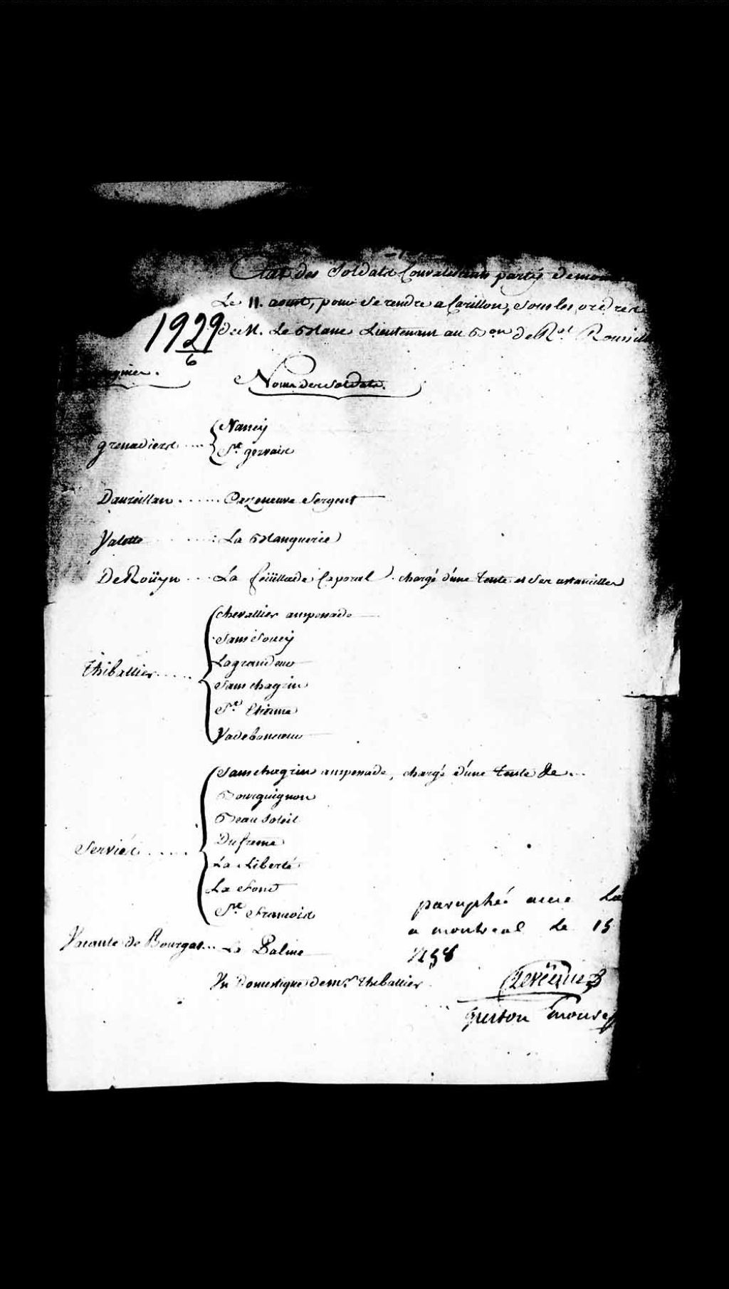 - Procès criminel contre Jacques Levesque (Lévêque), âgé de 27 ans, ci-devant sergent dans la compagnie de Du Coin au bataillon de Royal-Roussillon et actuellement soldat en garnison à Carillon, accusé de faux
