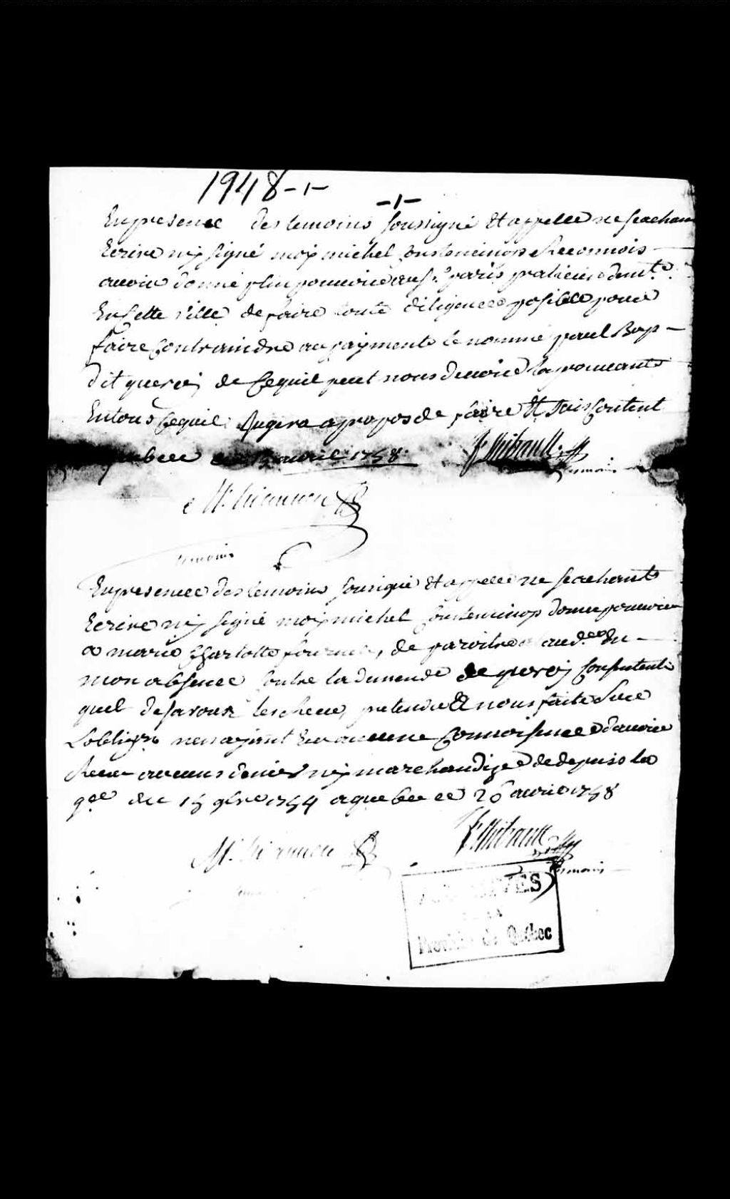 - Ce dossier en matières civiles provient de la Prévôté de Québec. Il comprend un acte de procuration de Michel Constantineau au sieur Paris, praticien et à Marie-Charlotte Fournel; trois exploits de signification audit Quercy; un exploit de signification à propos d'une saisie; une quittance et exploits de significations au bas; un extrait des registres de la Prévôté de Québec qui ordonne au défendeur de comparaître en personne; ainsi que les conclusions formulées par le demandeur