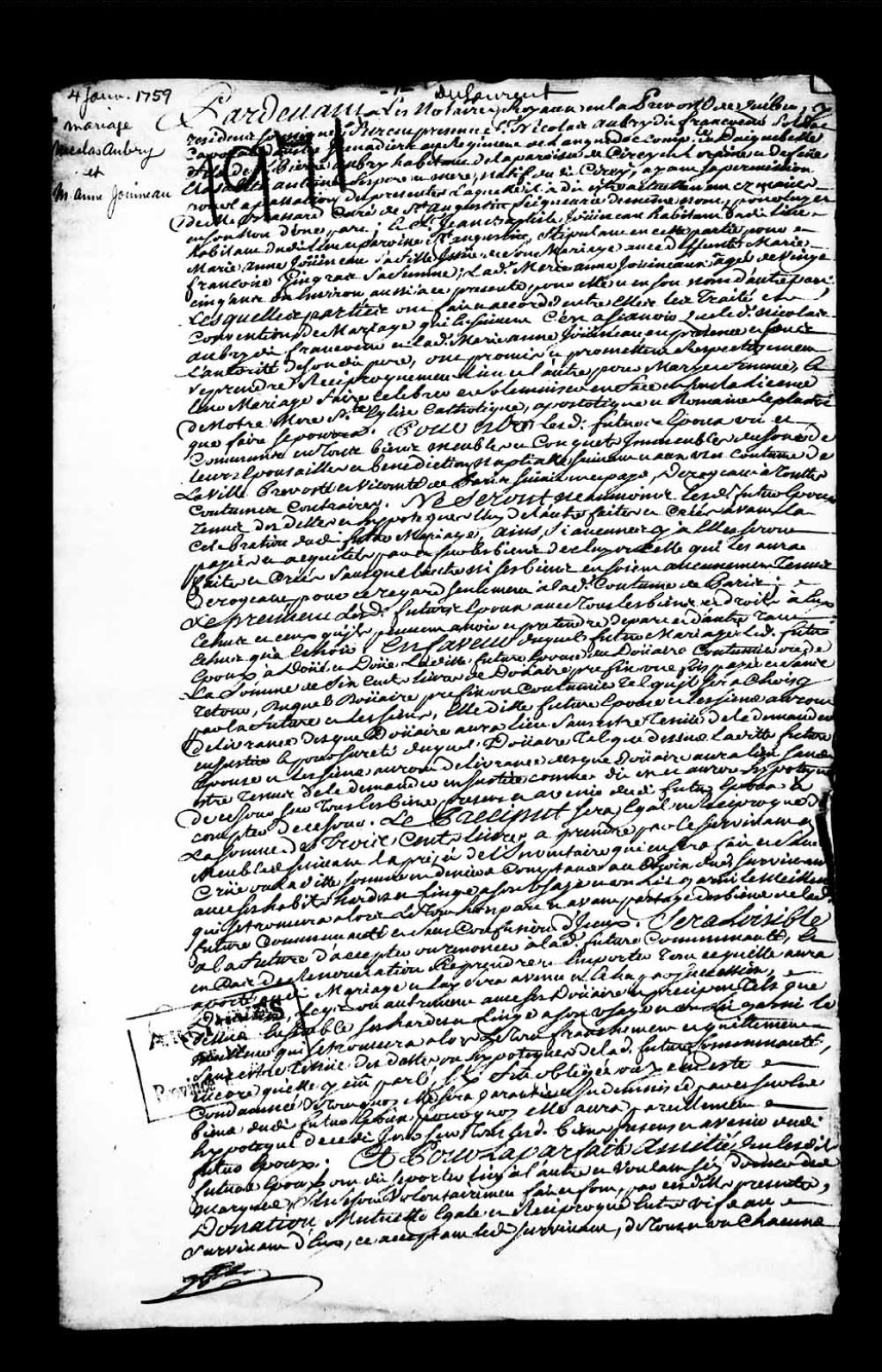 Contrat de mariage de Nicolas Aubry dit Francoeur, soldat caporal dans les Grenadiers au régiment de Languedoc, compagnie de Daiguebelle, fils de Pierre Aubry, habitant de la paroisse de Cirey, en Lorraine, et d'Élisabeth Antoine; et Marie-Anne Jouïneau (Jouineau), fille de Jean-Baptiste Jouïneau, habitant de Saint-Augustin, et de défunte Marie-Françoise Gingras, 4 janvier 1759, Archives nationales à Québec, Collection Pièces judiciaires et notariales, (03Q,TL5,D1971).
