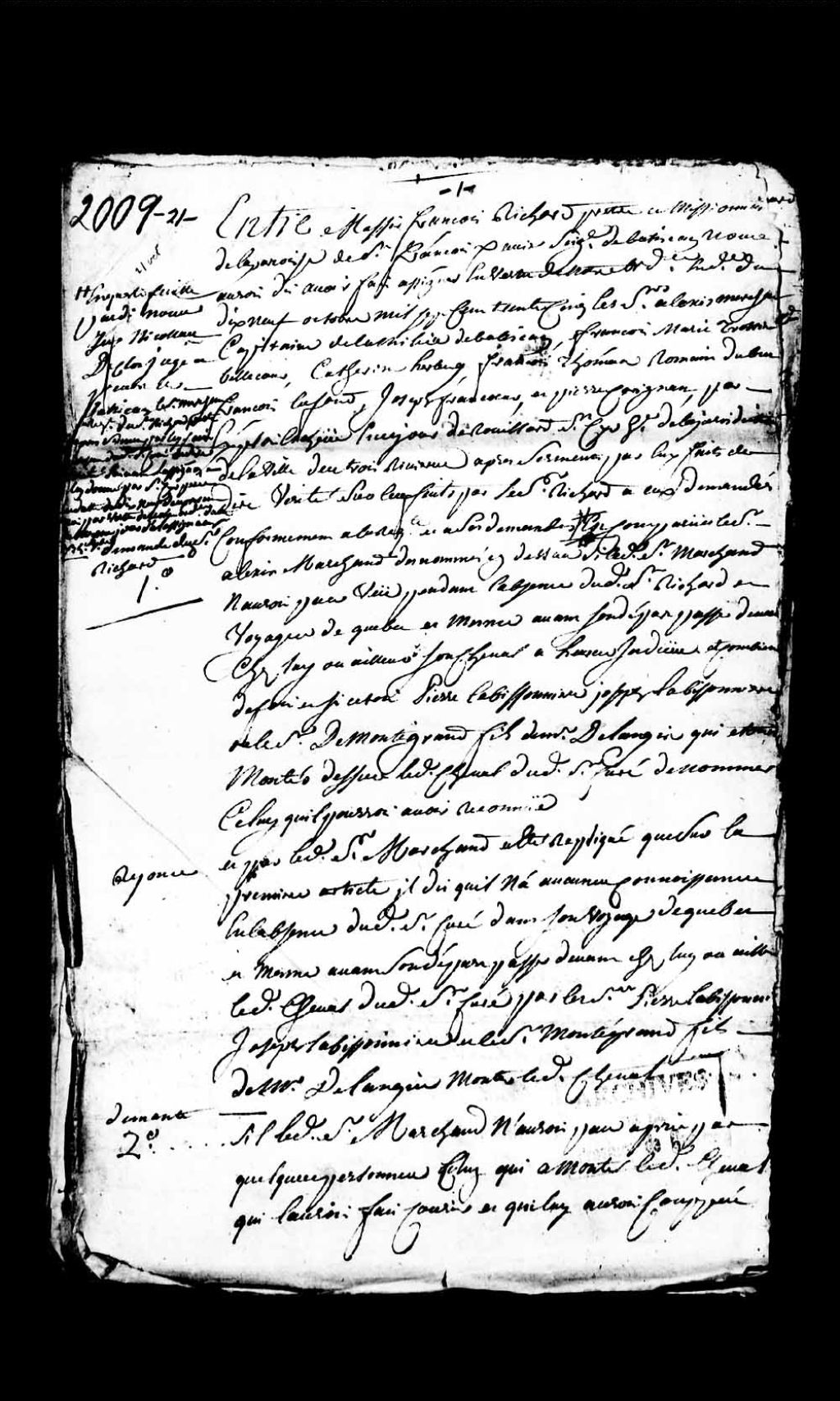 - Procédures en matière civile faites en la seigneurie de Batiscan par le juge prévôt Nicolas Duclos, à la suite de la requête de messire François Richard, prêtre missionnaire de la paroisse de Saint-François-Xavier en ladite seigneurie de Batiscan, contre Pierre Trottier de LaBissonnière, Joseph Trottier de LaBissonnière et le sieur de Montegrand, fils du sieur de Langis (Langy), accusés d'avoir pris et monté le cheval dudit Richard pendant que celui-ci était en voyage à Québec