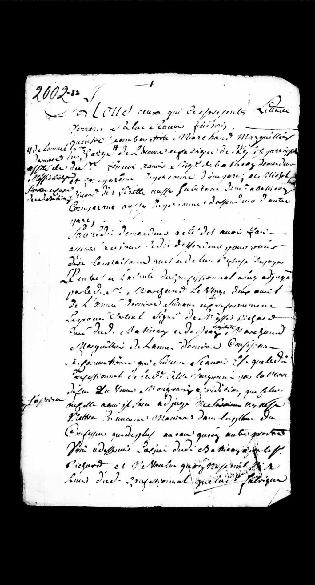 Le titre complet de la pièce se lit comme suit : Jugement rendu par le juge prévôt de la seigneurie de Batiscan, Jacques Rouillard dit Fonville, en faveur de Jean-Baptiste Marchand, marguillier de la fabrique de l'église paroissiale de Saint-François-Xavier en ladite seigneurie, dans la cause l'opposant à Michel Rivard dit Fiset, habitant demeurant à Batiscan, concernant le non paiement du contrat de concession et de la rente du confessionnal adjugé audit Rivard et laissé vacant par la mort de la veuve Mongrain, lequel Rivard est condamné à payer au demandeur la somme de 21 livres 15 sols, et prestation de serment dudit Marchand à l'effet que ledit Rivard avait bien demandé ledit contrat de concession dudit confessionnal