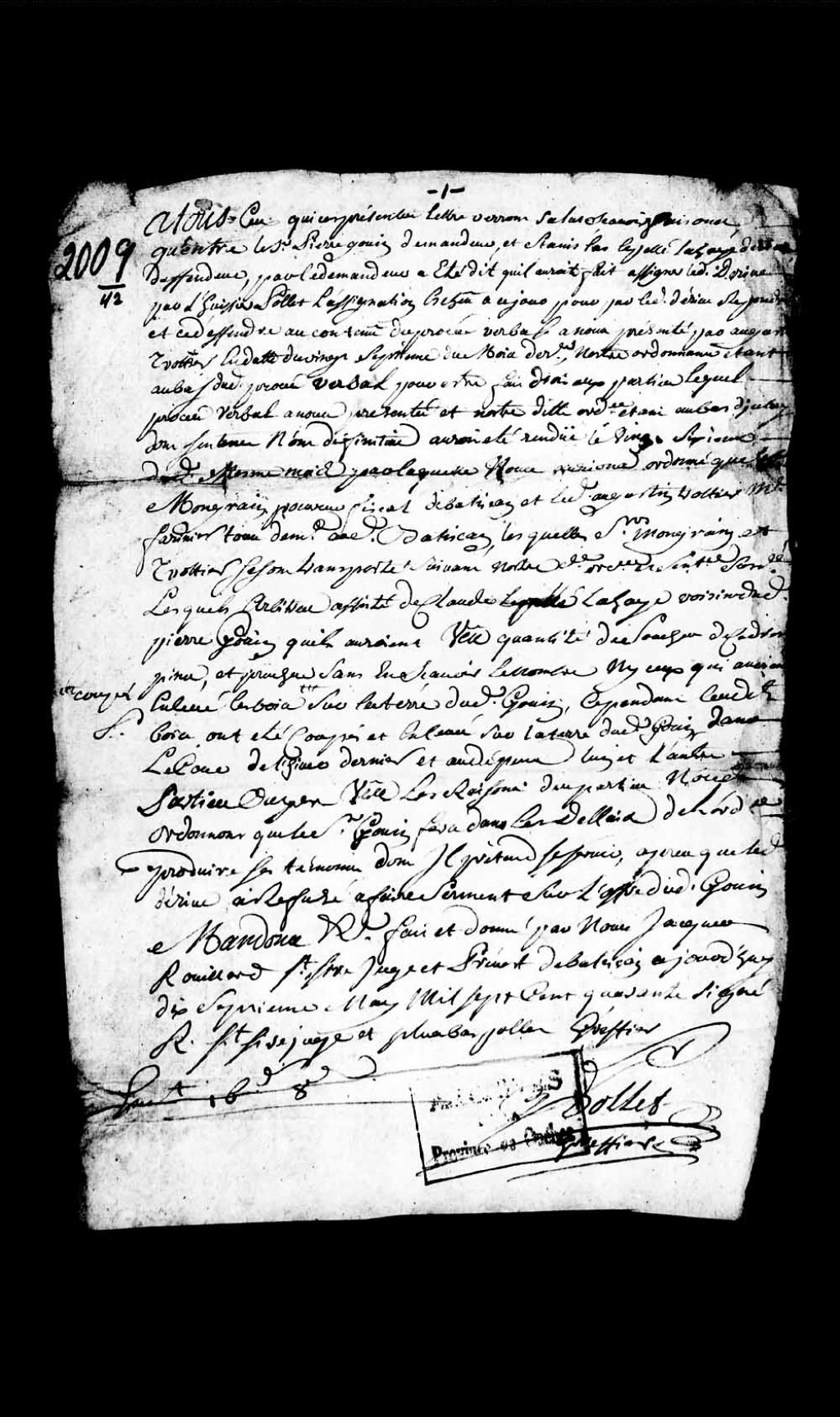 - Report de la sentence du juge prévôt de la seigneurie de Batiscan, Jacques Rouillard dit Fonville, dans la cause opposant Pierre Gouin à Michel-Stanislas Lepellé dit Lahaye Dérive, concernant du bois coupé par ledit Lepellé sur la terre dudit Gouin sans sa permission…