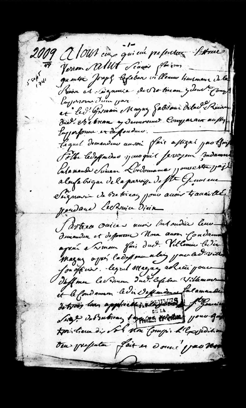 Jugement rendu par le juge prévôt de la seigneurie de Batiscan, Jacques Rouillard dit Fonville, en faveur de Joseph Lefebvre dit Villemur, lieutenant de milice de la rivière et seigneurie dudit Batiscan, dans la cause l'opposant à Germain Magnan, habitant de ladite rivière dudit Batiscan, lequel est condamné, à la suite de la prestation de serment dudit Lefebvre, à payer une amende de trois livres applicable à la paroisse Sainte-Geneviève pour avoir travaillé pendant le service divin, 5 septembre 1741, Archives nationales à Québec, Collection Pièces judiciaires et notariales, (03Q,TL5,D2009-49).