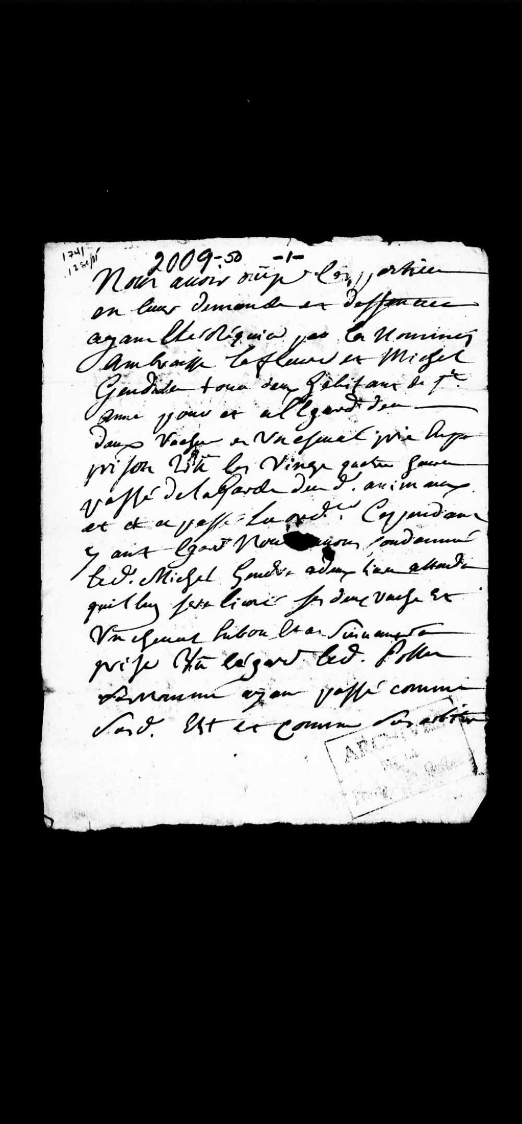 Sentence rendue dans la cause opposant Ambroise Brousson dit Lafleur, habitant de Sainte-Anne, à Michel Gendras, aussi habitant dudit lieu, concernant deux vaches et un cheval, lequel Gendras est condamné à payer deux livres étant donné que lui seront livrés lesdites deux vaches et ledit cheval, 19 septembre 1741, Archives nationales à Québec, Collection Pièces judiciaires et notariales, (03Q,TL5,D2009-50).