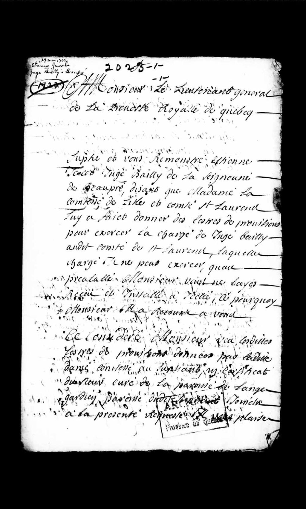 Supplique de Étienne Jacob, juge bailli de la seigneurie de Beauport, pour être reçu en la charge de juge bailli de l'île et comté de Saint-Laurent, à la requête de madame la comtesse de l'île, suivie des conclusions du procureur du Roi qui accorde un certificat, attestant de ses capacités à remplir cette fonction, au dit sieur Jacob, 29 mai 1703 - 1er juin 1703, Archives nationales à Québec, Collection Pièces judiciaires et notariales, (03Q,TL5,D2023).
