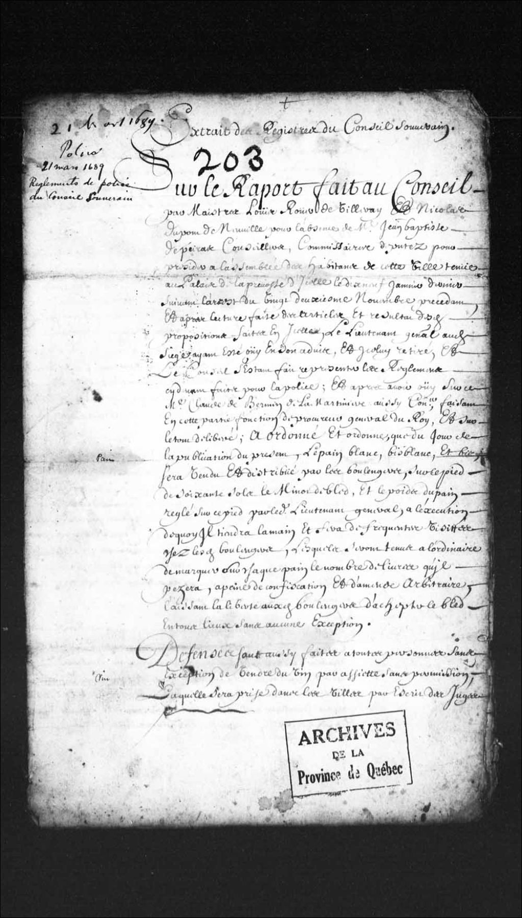 - Copie originale faite et signée par Peuvret, greffier du Conseil souverain de Québec, registrée de l'ordonnance du lieutenant général civil et criminel de la Prévôté de Québec, le 1er avril 1689Le titre complet de la pièce se lit comme suit : Règlements de police du Conseil souverain de Québec, portant sur les boulangers, sur la vente du vin par assiette, sur les poids et mesures, sur les brancards et poids dans les moulins à farine, sur un terrain pour y déposer le bois de chauffage, sur la mesure du bois de chauffage, sur la construction des cheminées, sur l'alignement des maisons, sur la défense de prendre du tabac dans les rues, puis à la basse ville, sur la pierre de construction, sur le foin, sur les responsabilité des entrepreneurs, sur le pavage des rues à la Basse-Ville et sur le nettoyage du Cul de sac