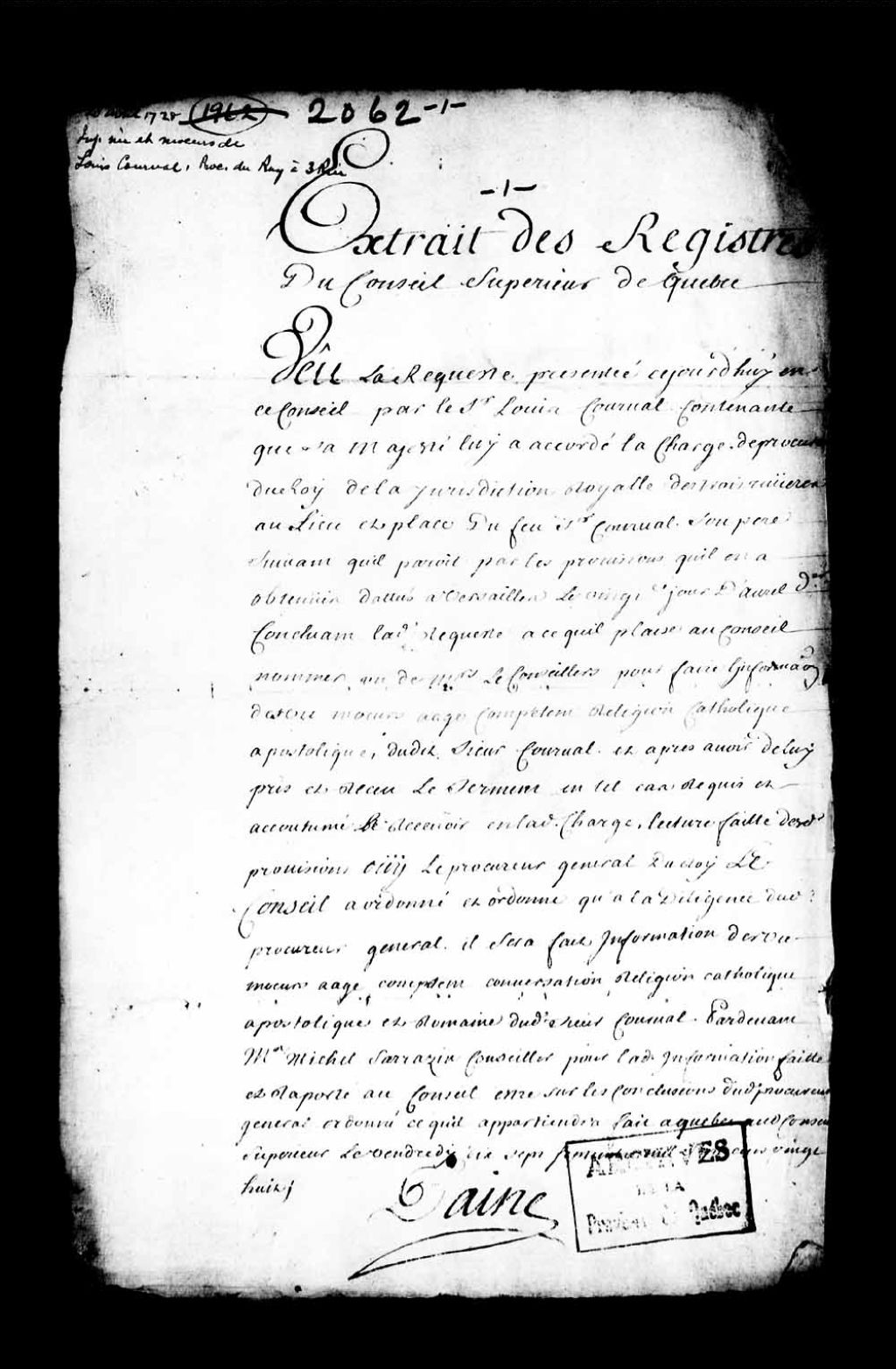 - Ce dossier provient du Conseil supérieur de Québec. Il comprend les témoignages et les dépositions des personnes suivantes : Grabriel Greysac, âgé de 42 ans; Perthuis, âgé de 30 ans. Ce dossier comprend un extrait des registres du Conseil supérieur de Québec; les conclusions du procureur du Roi; confirmation par Boullard, curé de Québec, que le sieur Courval est de religion catholique romaine; l'information faite au Conseil supérieur de Québec
