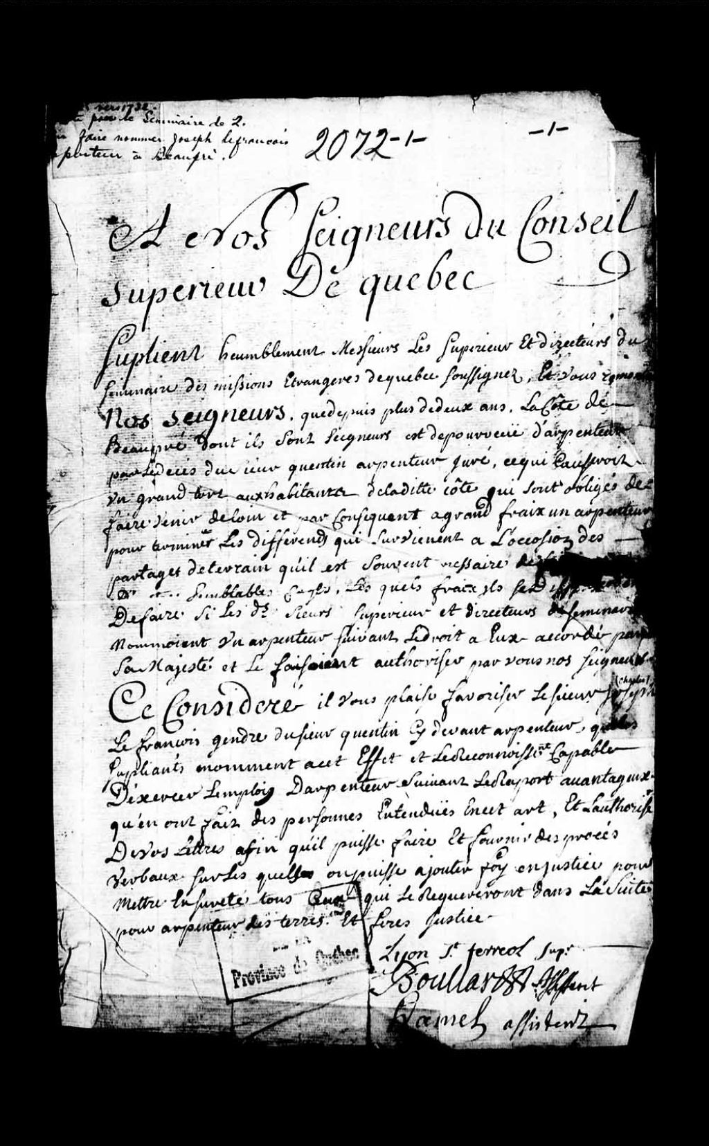 - Information de vie et moeurs de Charles Lefrançois, habitant de L'Ange-Gardien, nommé arpenteur royal de Beaupré par provisions de monseigneur l'intendant en date du 12 janvier 1732, à la requête des supérieurs et directeurs du Séminaire des missions étrangères de Québec, pour exercer la charge d'huissier royal en ce pays