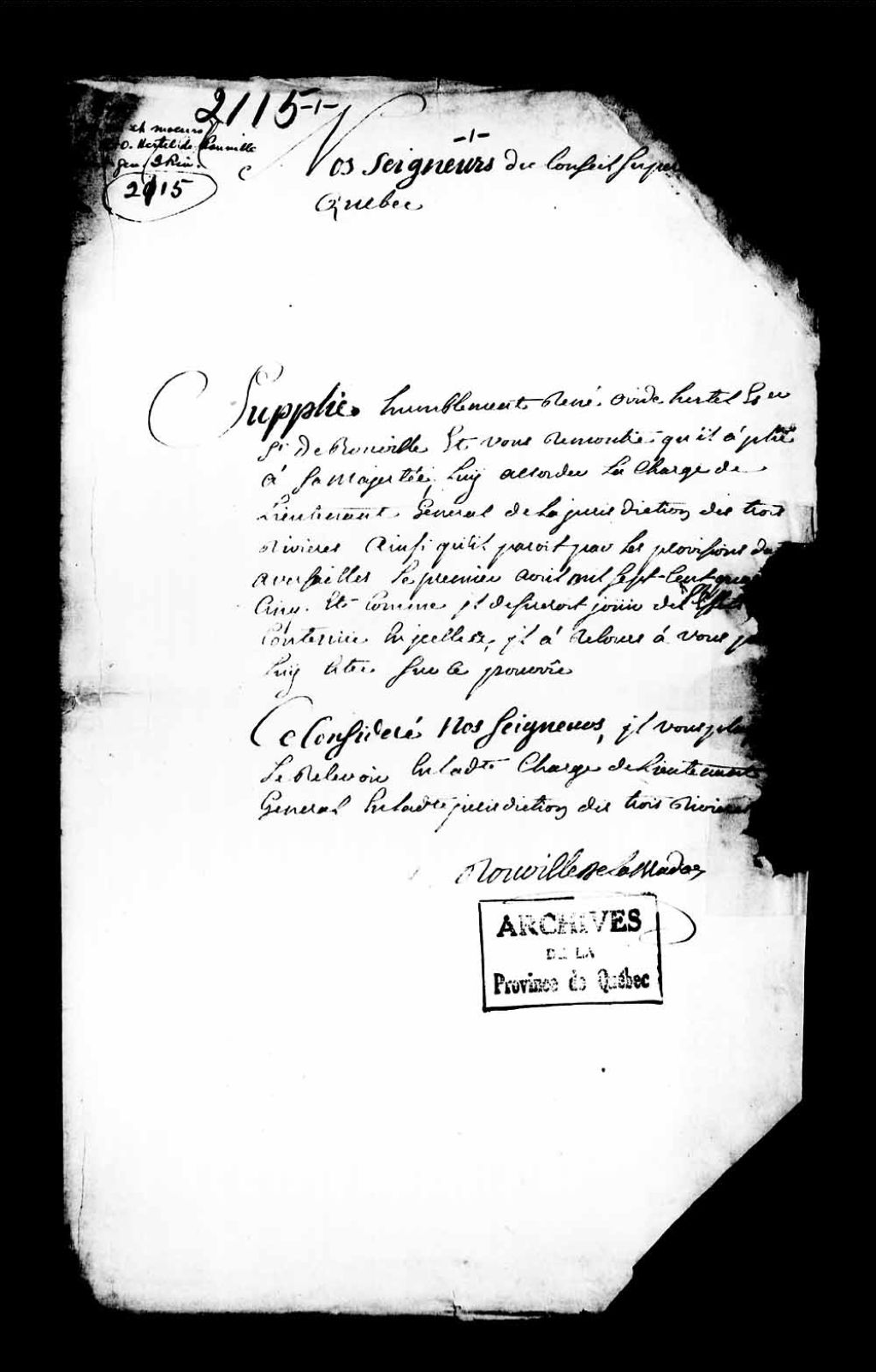 - Information de vie et moeurs de René-Ovide Hertel de Rouville, nommé par lettres du Roi en date du 1er avril 1745 lieutenant général de la Juridiction des Trois-Rivières