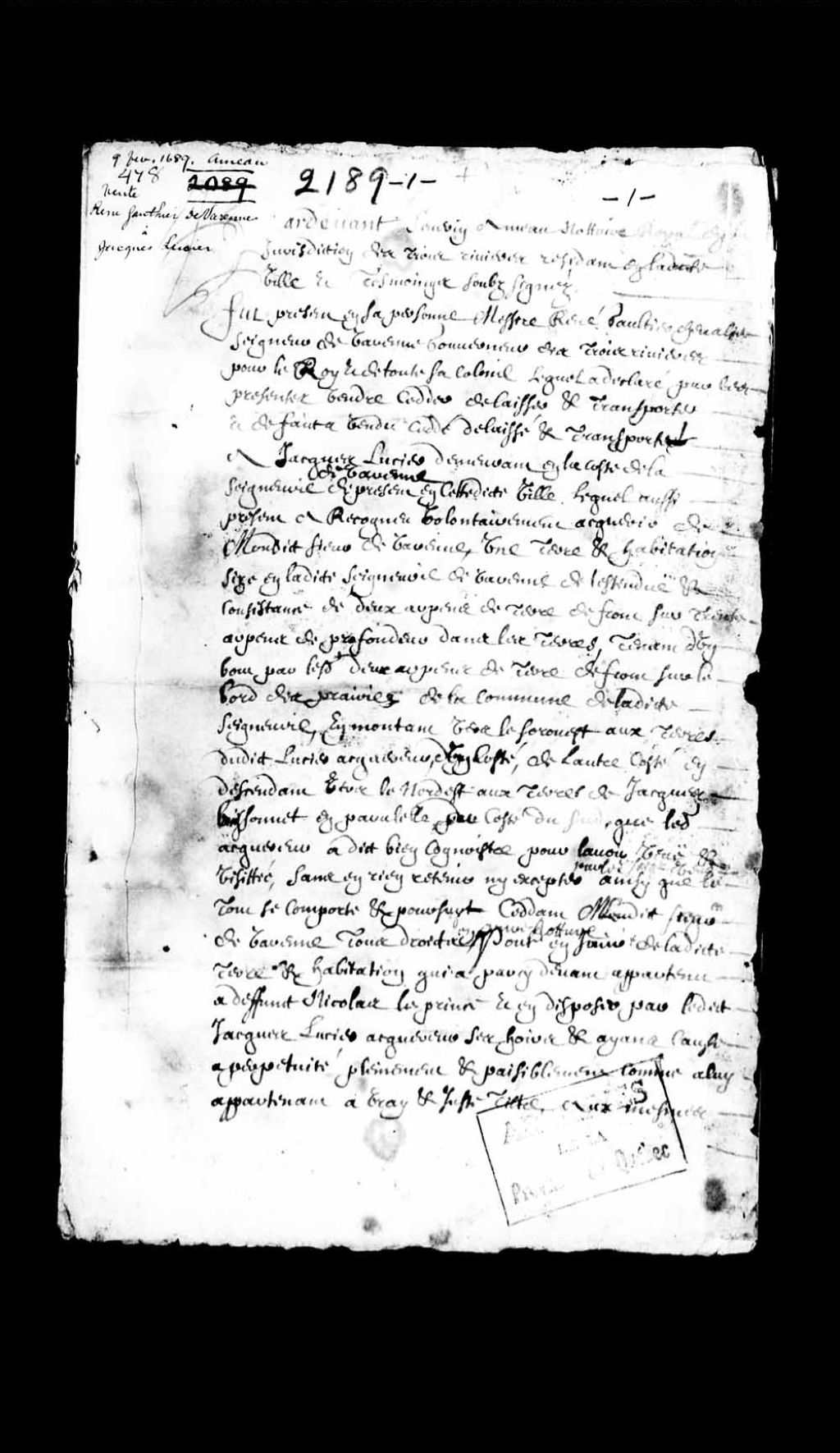 Vente par René Gaultier de Varennes, seigneur de Varennes, à Jacques Lussier, 9 février 1689, Archives nationales à Québec, Collection Pièces judiciaires et notariales, (03Q,TL5,D2189).