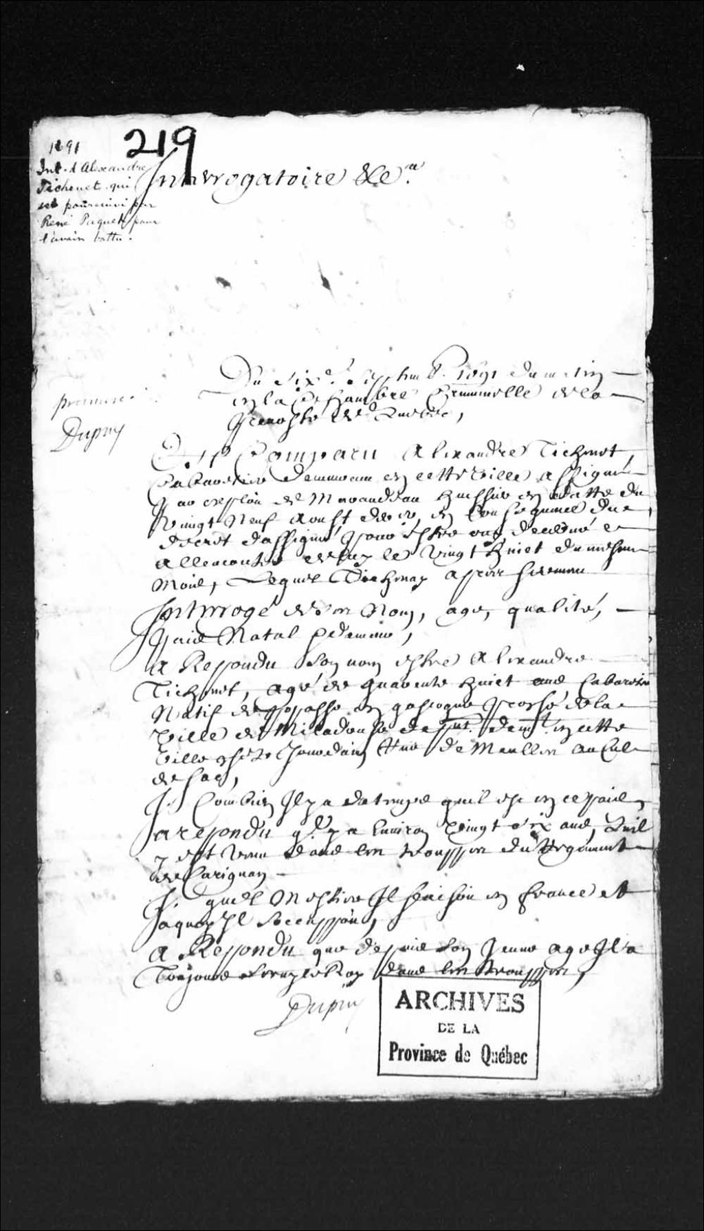 - Ce dossier en matières criminelles provient de la Prévôté de Québec et contient le témoignage d'Alexandre Trichenet, 48 ans, cabaretier, natif de Papasse, en Gascogne, proche de la ville de Micadouche, et à présent dans cette ville, chez Jourdain, rue de Meulles au Cul-de-Sac, venu en ce pays, il y a 26 ans comme soldat des troupes du Régiment de Carignan. Ce dossier comprend l'interrogatoire et les conclusions du procureur du Roi