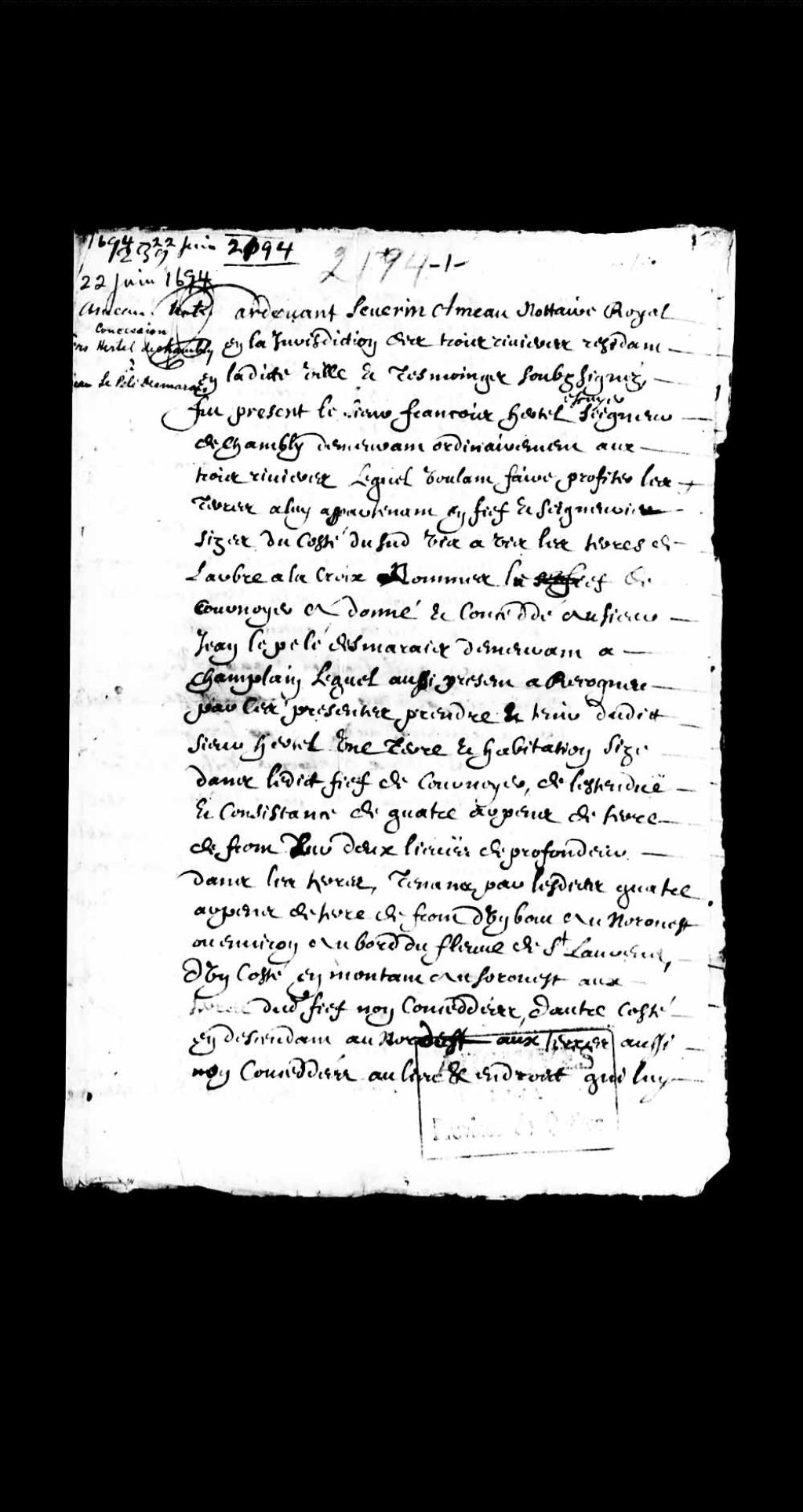 Concession par François Hertel de Chambly à Jean LePelé Desmarais, 22 juin 1694, Archives nationales à Québec, Collection Pièces judiciaires et notariales, (03Q,TL5,D2194).