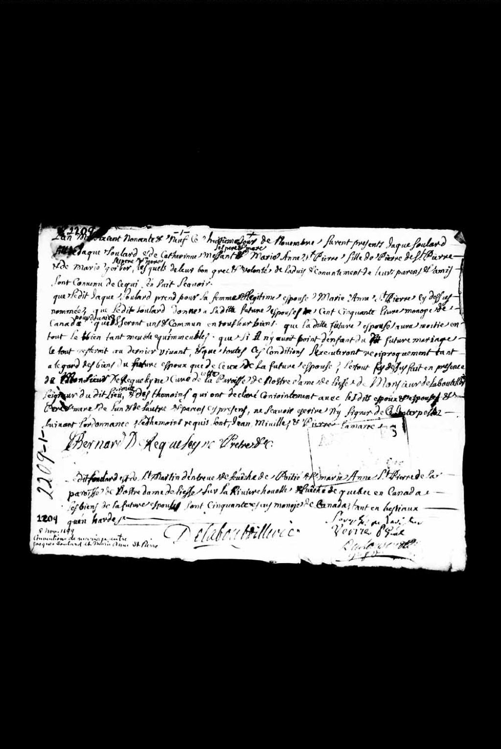 Conventions de mariage entre Jacques Soulard, natif de Saint-Martin, évêché de Poitiers, et Marie-Anne Saint-Pierre, fille de Pierre Saint-Pierre et de Marie Gerber, de la Rivière-Ouelle, 8 novembre 1699, Archives nationales à Québec, Collection Pièces judiciaires et notariales, (03Q,TL5,D2209).