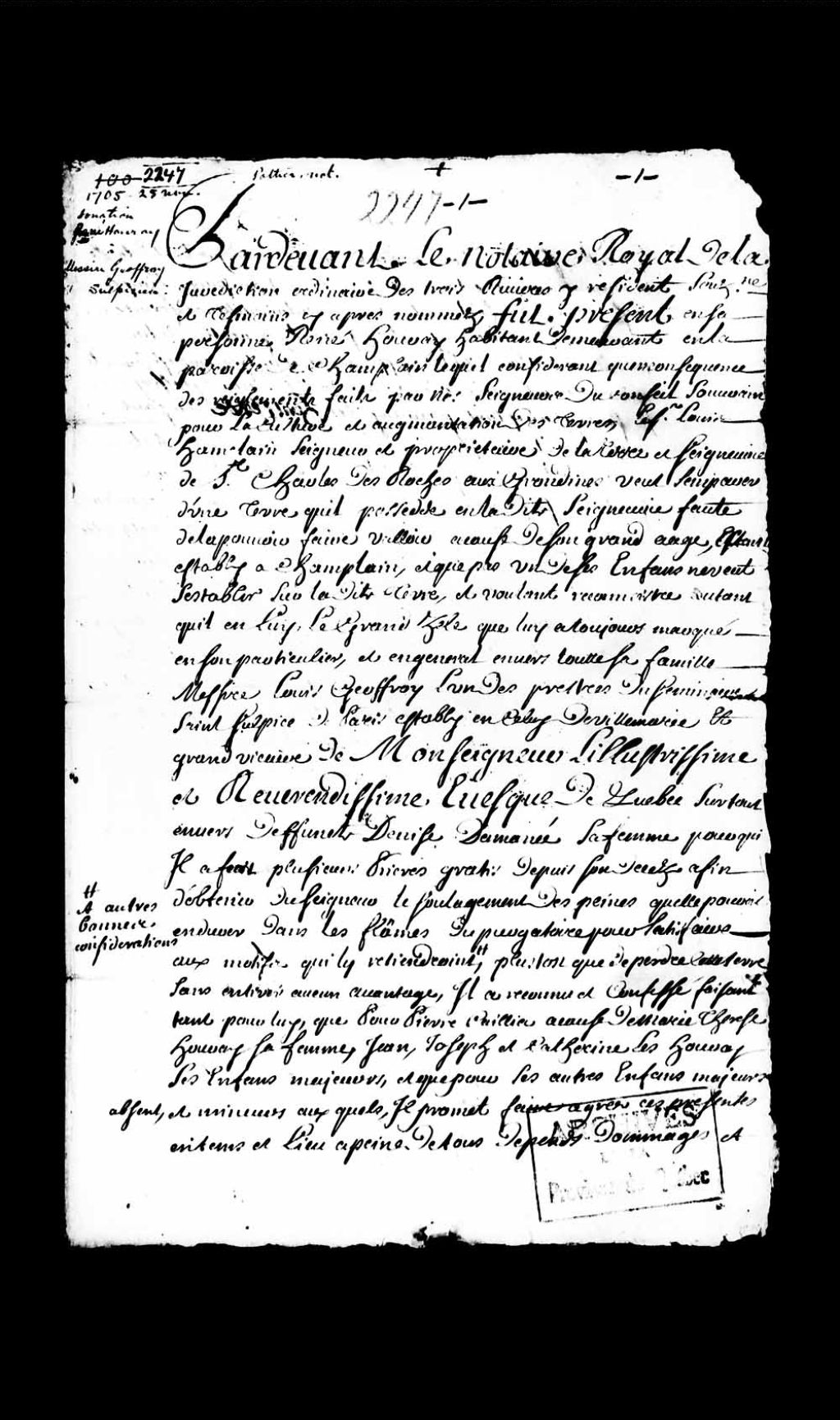 Donation par René Houray, habitant de la paroisse de Champlain, à messire Louis Geoffroy, sulpicien de Ville-Marie, 25 novembre 1705, Archives nationales à Québec, Collection Pièces judiciaires et notariales, (03Q,TL5,D2247).