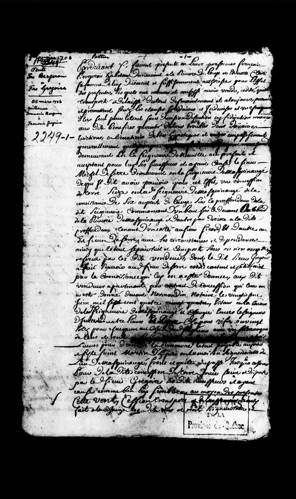 Vente par François Bergeron, habitant de la Rivière-du-Loup, et Étiennette Clerc, sa femme, à François Grégoire, marchand de Neuville
