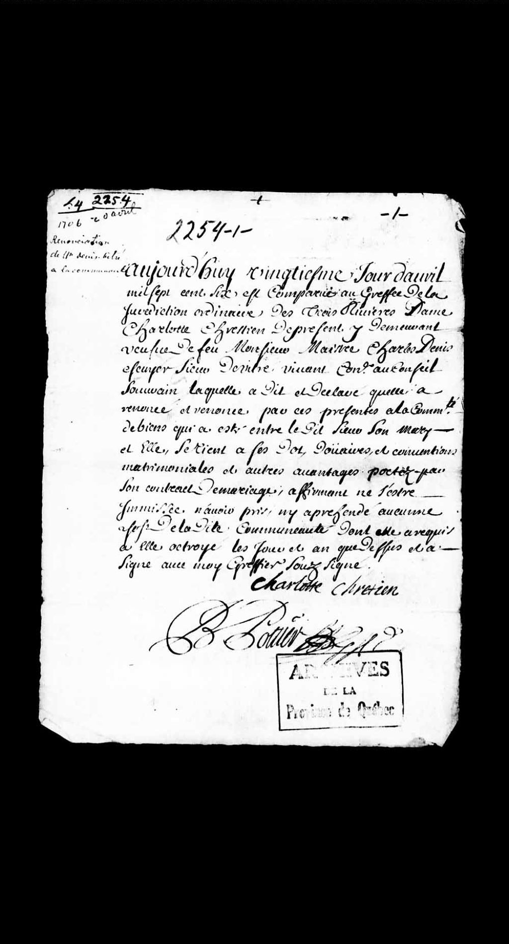 Renonciation de Charlotte Chrétien, veuve de Charles Denis, sieur de Vitré, vivant conseiller au Conseil Souverain, à la communauté qui a été entre elle et son défunt mari, 20 avril 1706, Archives nationales à Québec, Collection Pièces judiciaires et notariales, (03Q,TL5,D2254).