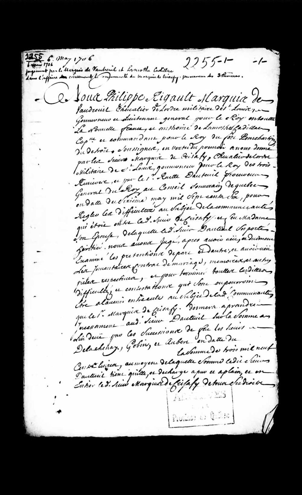 - Jugement par Philippe Rigault, marquis de Vaudreuil, chevalier de l'ordre militaire de Saint-Louis, gouverneur et lieutenant général pour le Roi en toute la Nouvelle-France, et Antoine de Lamothe Cadillac, capitaine et commandant pour le Roi du fort Pontchartrain du Détroit, dans l'affaire concernant la communauté qui a été entre le marquis de Crisafy, chevalier de l'ordre militaire de Saint-Louis et gouverneur pour le Roi de Trois-Rivières, et feue madame son épouse