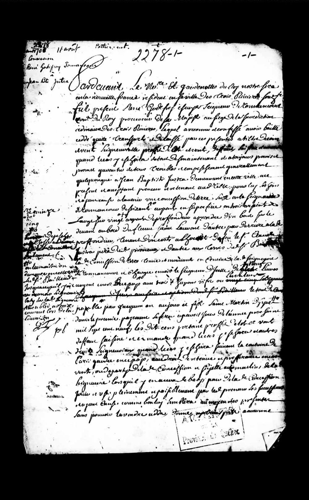 Concession par René Godefroy, seigneur de Tonnancour, conseiller du Roi, procureur de Sa Majesté au siège de la Juridiction ordinaire des Trois-Rivières, à Jean-Baptiste Jutras, de Trois-Rivières, d'une terre dans la seigneurie de Tonnancour, 11 août 1708, Archives nationales à Québec, Collection Pièces judiciaires et notariales, (03Q,TL5,D2278).