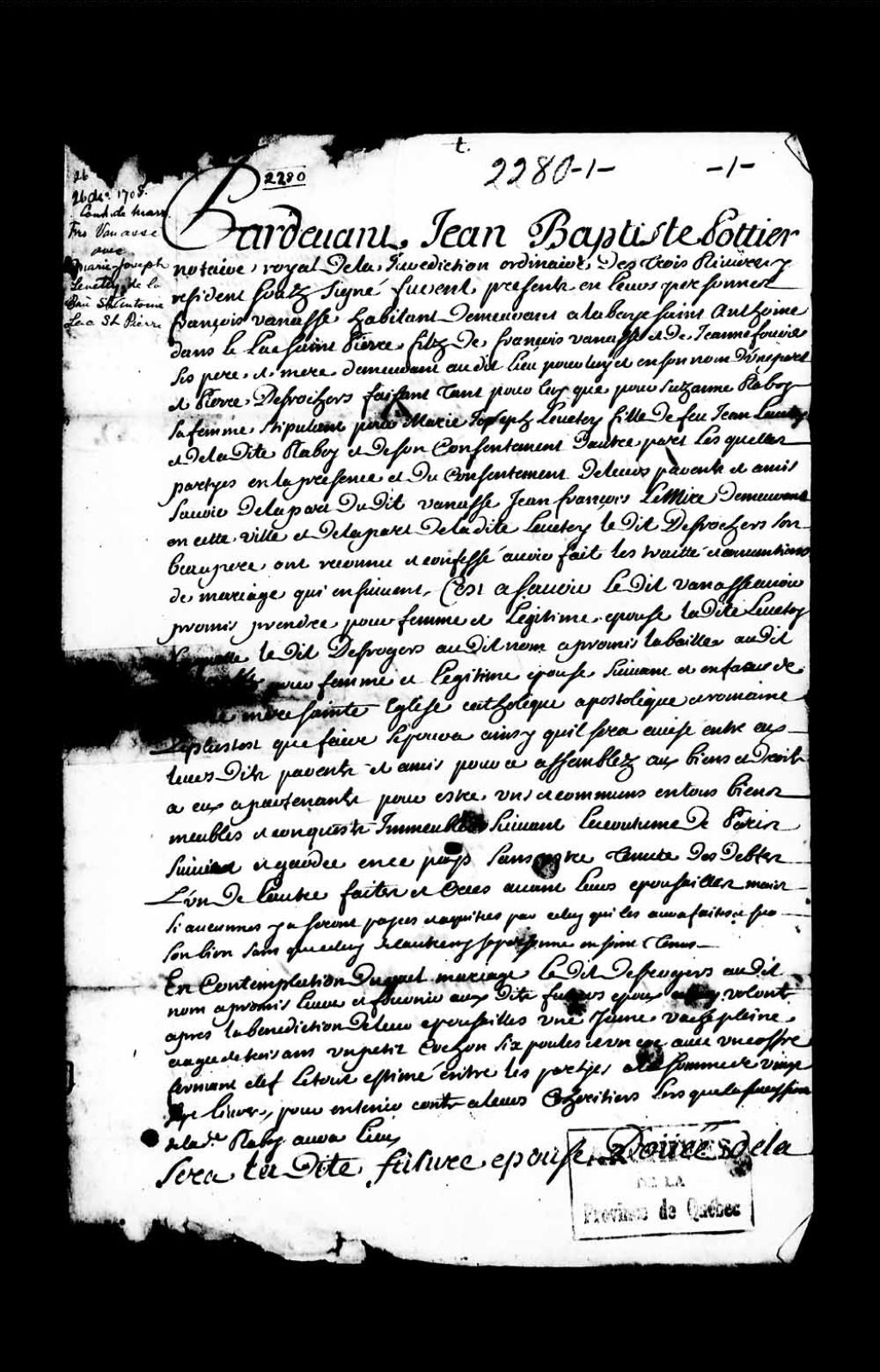 Contrat de mariage de François Vanasse, habitant de la Baie Saint-Antoine, dans le lac Saint-Pierre, fils de François Vanasse et de Jeanne Fourrier, et de Marie-Joseph Levetey (Lefettey), fille de feu Jean Levetey et de Suzanne Raboy (Rabouin), du même lieu, 26 décembre 1708, Archives nationales à Québec, Collection Pièces judiciaires et notariales, (03Q,TL5,D2280).