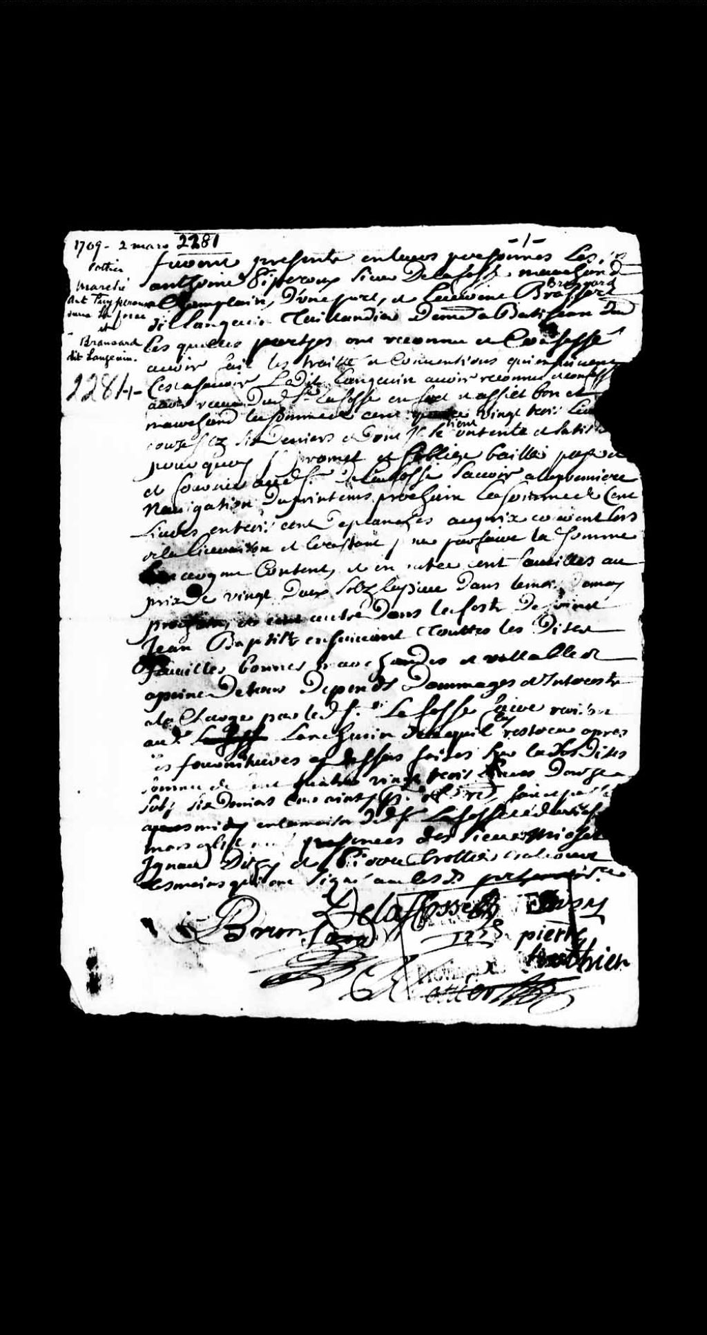Marché entre Antoine Puypérou, sieur de LaFosse, marchand de Champlain, et Laurent Brassard (Bransard) dit Langevin, taillandier, de Batiscan, pour du fer et de l'acier, 2 mars 1709, Archives nationales à Québec, Collection Pièces judiciaires et notariales, (03Q,TL5,D2281).
