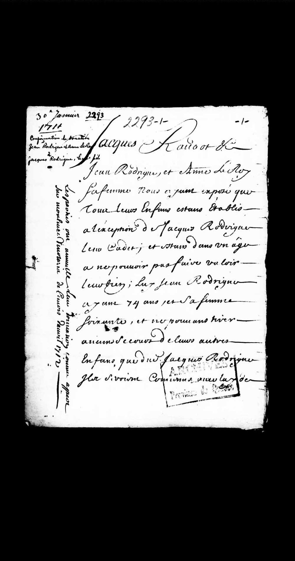 - Ordonnance de l'intendant Jacques Raudot qui permet à Jean Rodrigue, 74 ans, et Anne LeRoy, 60 ans, sa femme, de faire une donation de leur terre et bestiaux à Jacques Rodrigue, leur fils, à la condition de les nourrir et entretenir leur vie durant