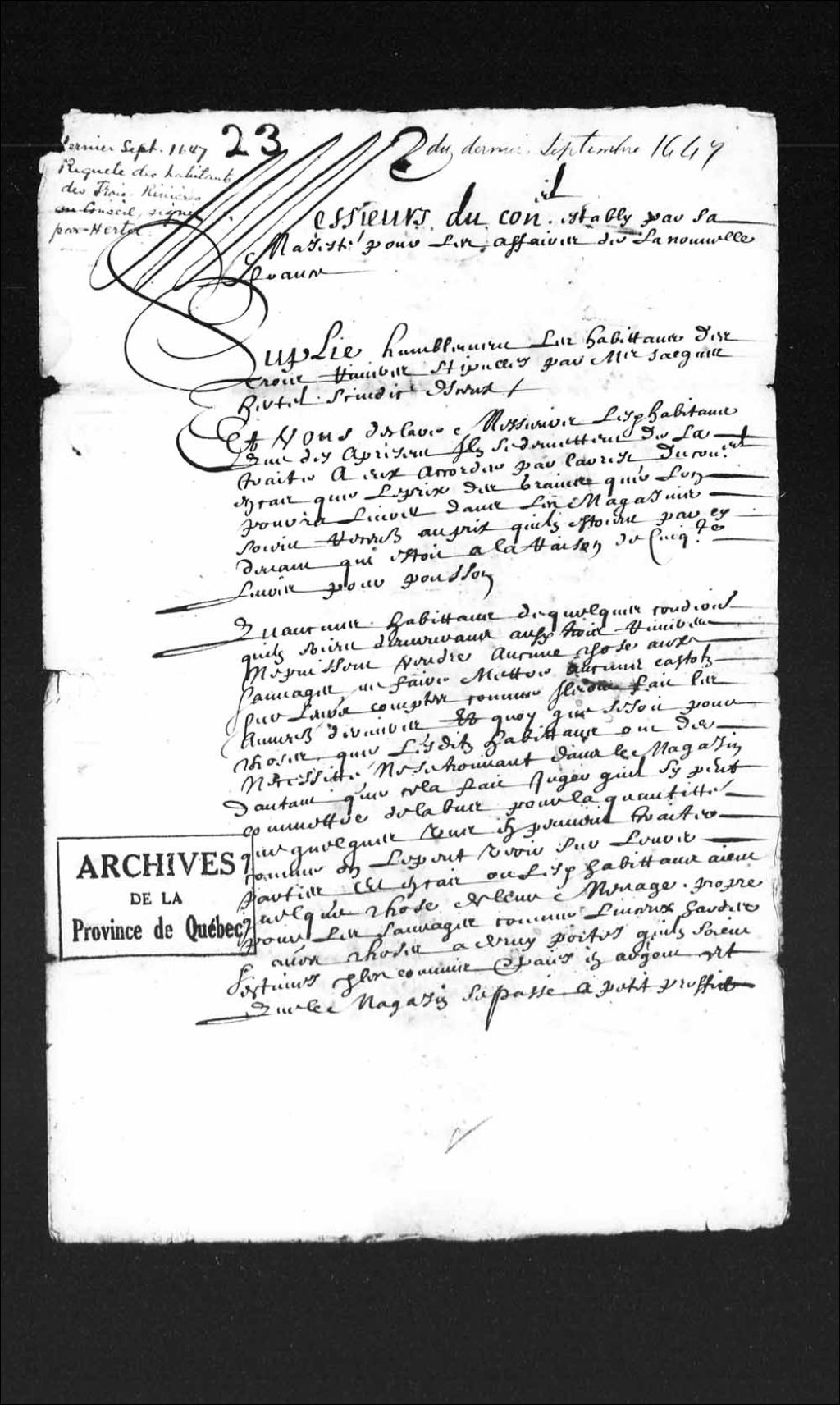 Requête par Jacques Hertel, syndic des habitants de Trois-Rivières, adressée en leurs noms au Conseil de Québec pour se démettre de la traite avec les sauvages (Amérindiens) qui leur a été accordée par l'arrêt du Conseil d'État du Roi et autres considérations de commerce, 30 septembre 1647, Archives nationales à Québec, Collection Pièces judiciaires et notariales, (03Q,TL5,D23).