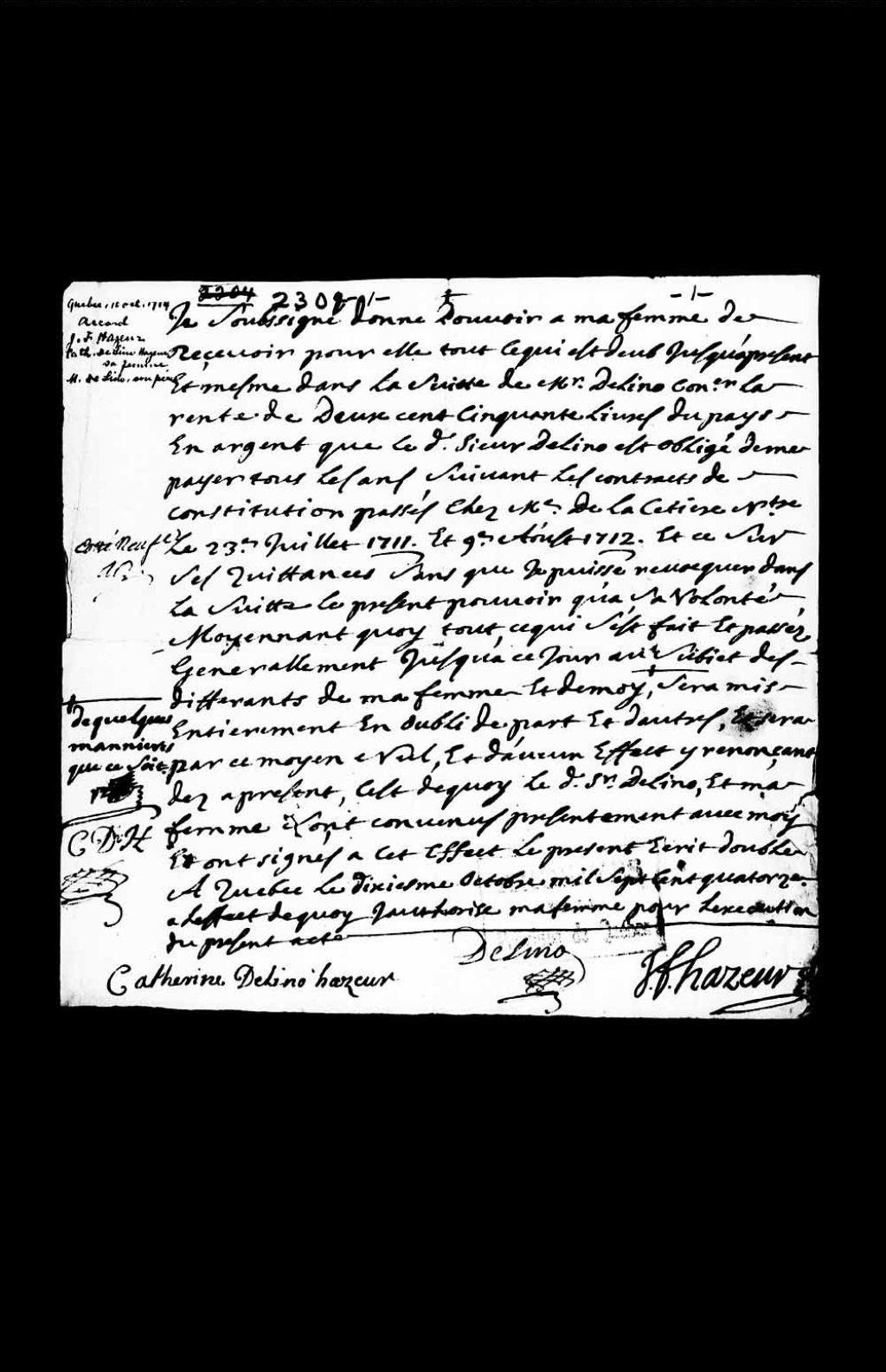 Accord entre Jean-François Hazeur, Catherine de Lino Hazeur, sa femme, et Monsieur deLino, son père, 10 octobre 1714, Archives nationales à Québec, Collection Pièces judiciaires et notariales, (03Q,TL5,D2304).