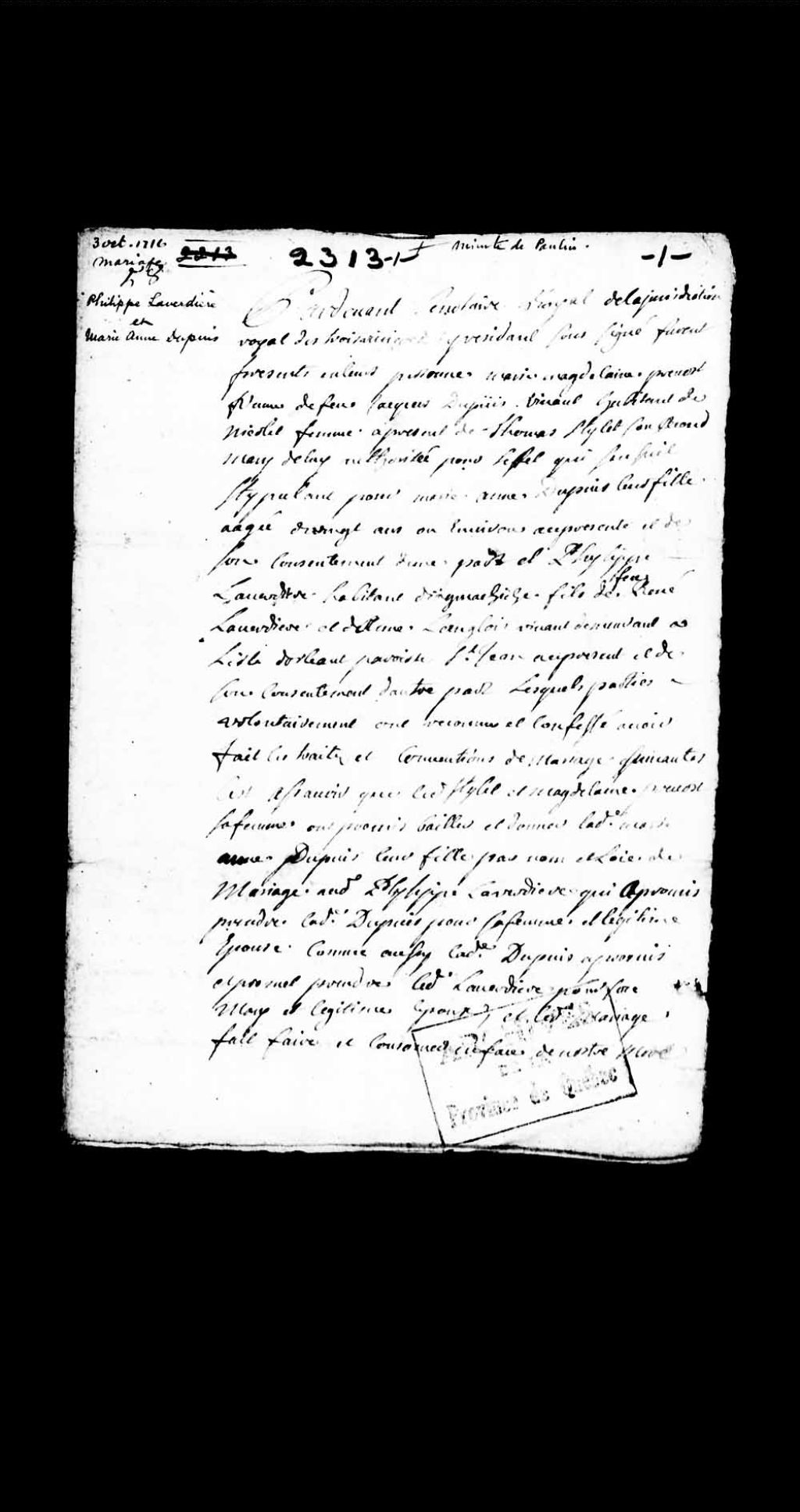 Contrat de mariage de Philippe Laverdière, habitant d'Yamachiche, fils de feu René Laverdière, demeurant à l'île d'Orléans, paroisse de Saint-Jean, et d'Anne Langlois; et de Marie-Anne Dupuis, âgée de 20 ans, fille de feu Jacques Dupuis, habitant de Nicolet, et de Marie-Madeleine Prévost, maintenant épouse de Thomas Stylet, 3 octobre 1716, Archives nationales à Québec, Collection Pièces judiciaires et notariales, (03Q,TL5,D2313).