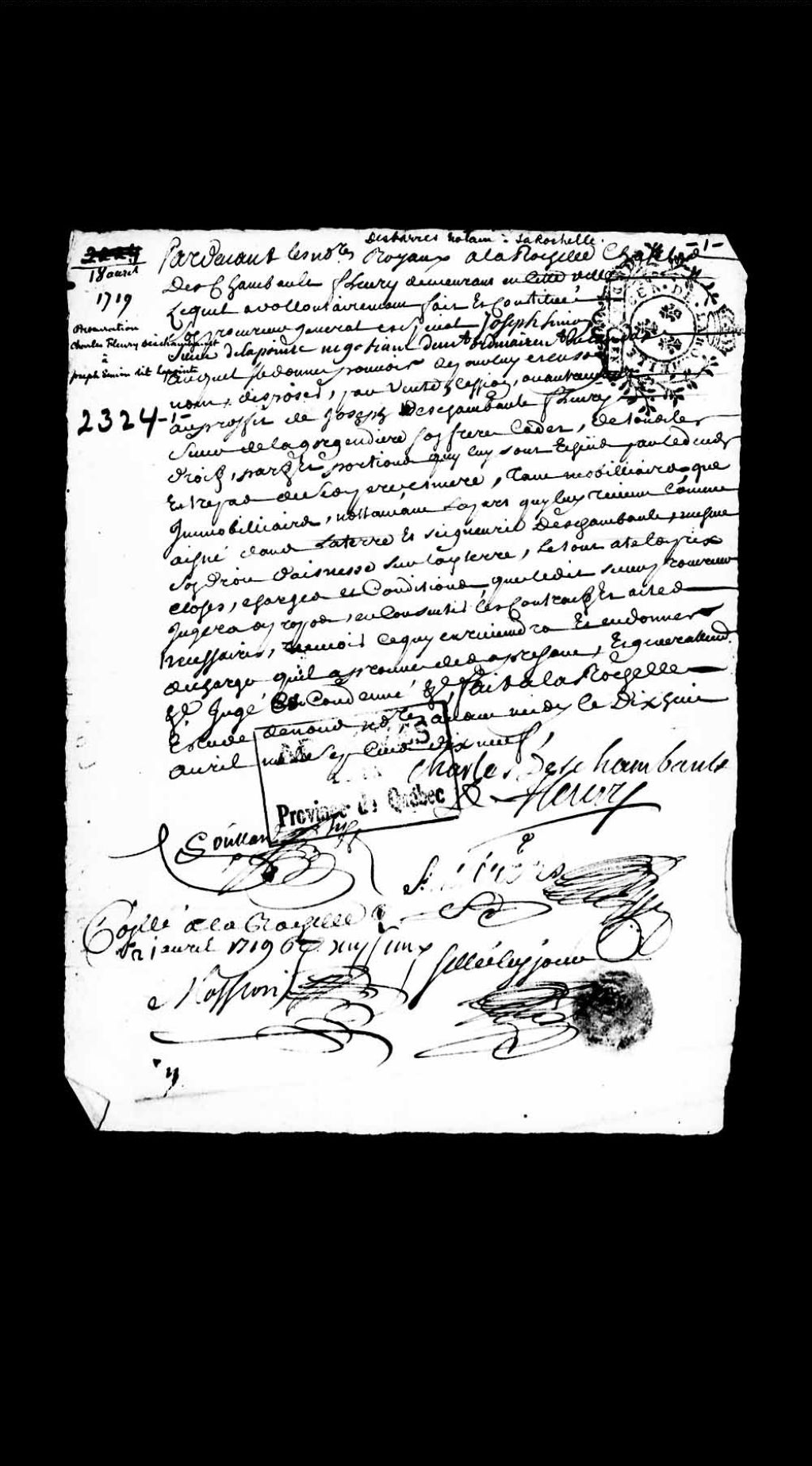 Procuration par Charles Fleury Deschambault, demeurant à La Rochelle, à Joseph Simon, sieur de Lapointe, négociant demeurant ordinairement au Canada, pour vendre la part qu'il lui vient comme aîné dans la seigneurie de Deschambault, même son droit d'aînesse sur ladite terre, à son frère cadet Joseph Deschambault Fleury, sieur de la Gorgendière, 18 avril 1719, Archives nationales à Québec, Collection Pièces judiciaires et notariales, (03Q,TL5,D2324).