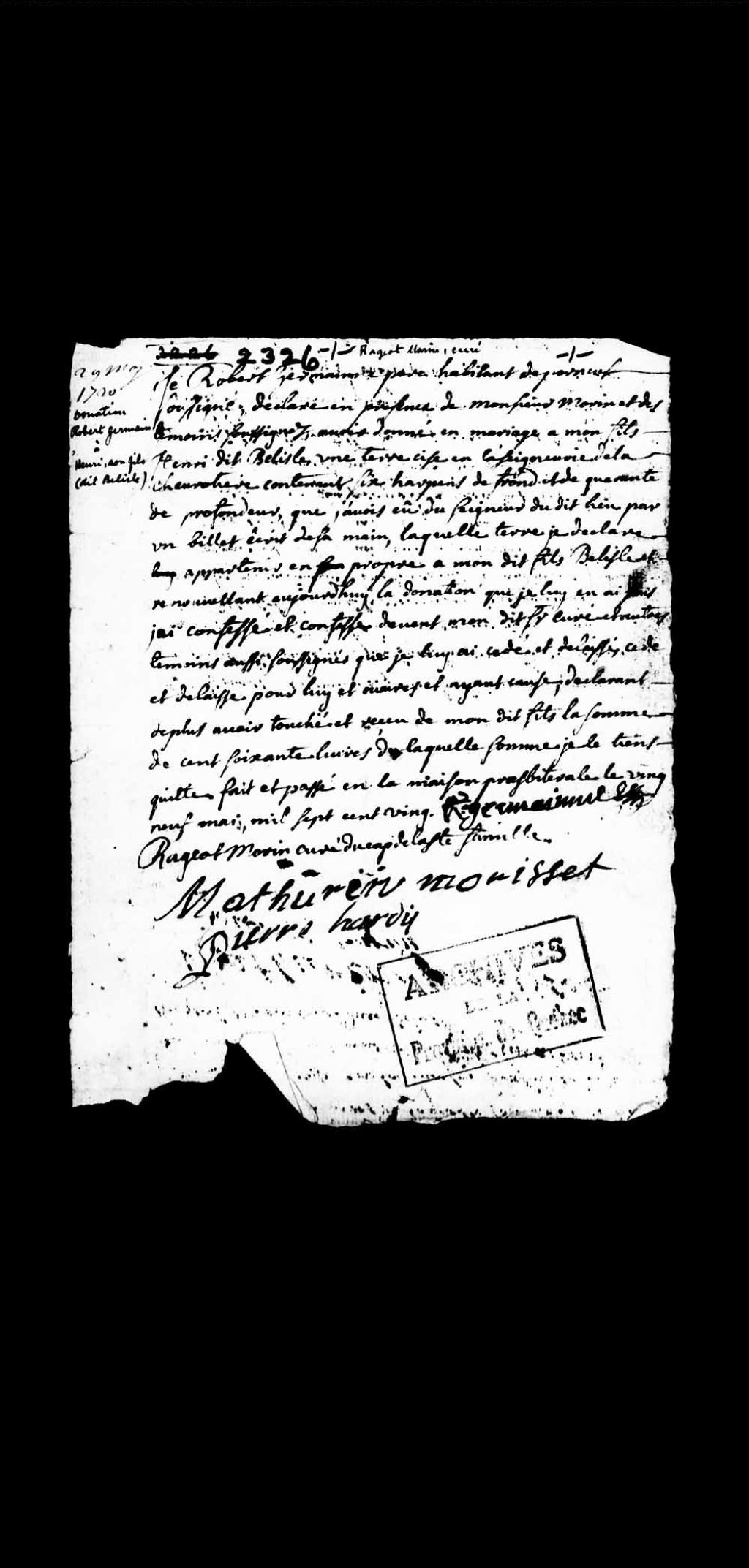 Donation par Robert Germain père, habitant de Portneuf, à Henri Germain dit Bélisle, son fils, d'une terre sise en la seigneurie de la Chevrotière, 29 mai 1720, Archives nationales à Québec, Collection Pièces judiciaires et notariales, (03Q,TL5,D2326).