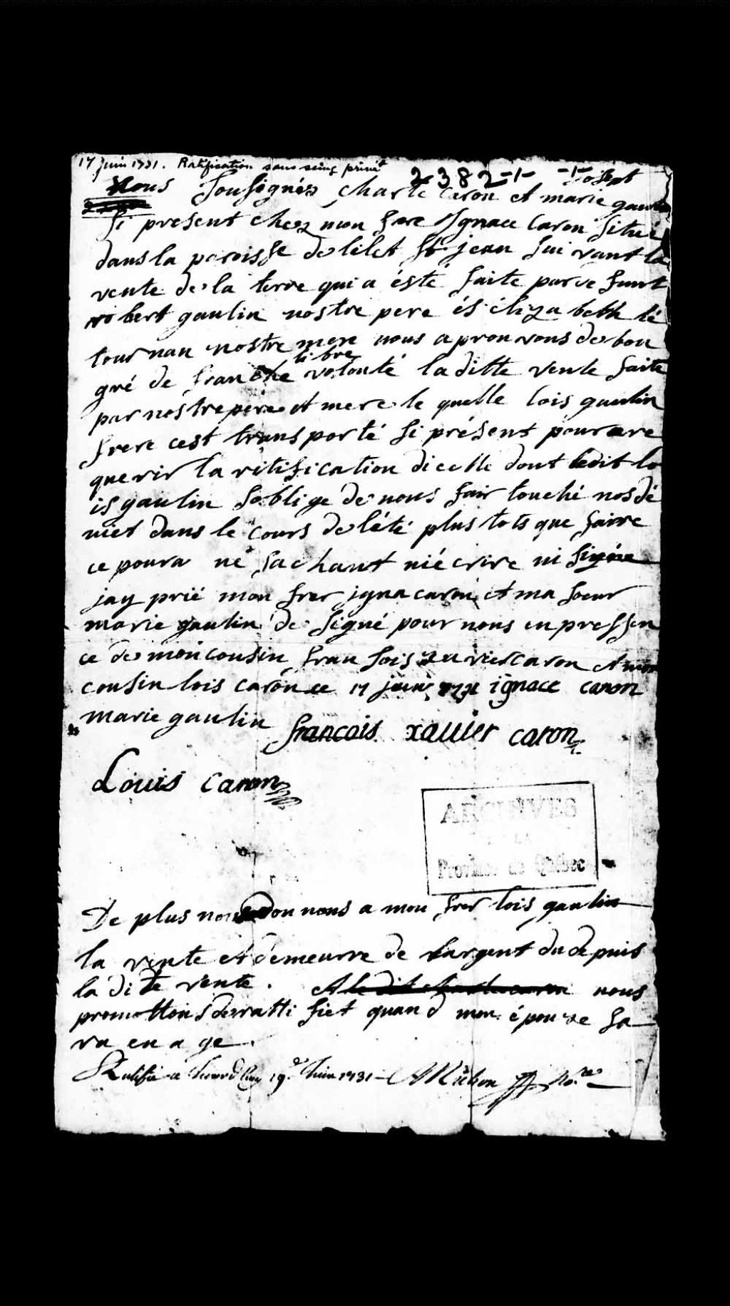 Ratification sous seing privé de la vente d'une terre par Charles Caron et Marie Gaulin à Louis Gaulin, ladite vente ayant été conclue par feu Robert Gaulin et Élisabeth Létourneau, leurs père et mère, 17 juin 1731, Archives nationales à Québec, Collection Pièces judiciaires et notariales, (03Q,TL5,D2382).