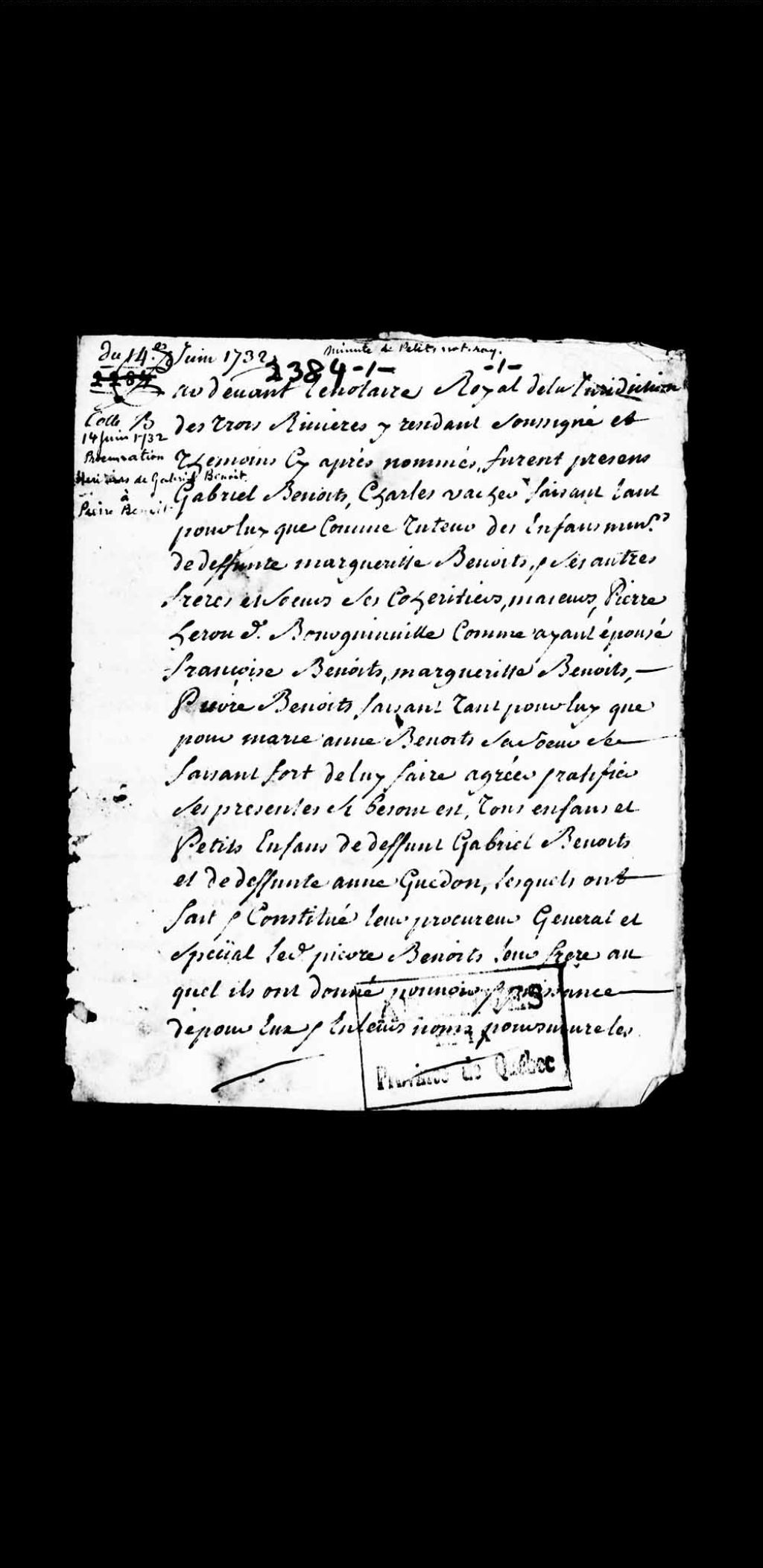 Procuration faite par les héritiers de feu Gabriel Benoît dit Laforest et de feue Marie-Anne Guédon, en faveur de Pierre Benoît, pour faire valoir leurs droits sur une terre sise dans la seigneurie de Champlain; de laquelle terre il leur revient un arpent pour le douaire coutimier accordée à ladite Guédon par son contrat de mariage, 14 juin 1732, Archives nationales à Québec, Collection Pièces judiciaires et notariales, (03Q,TL5,D2384).