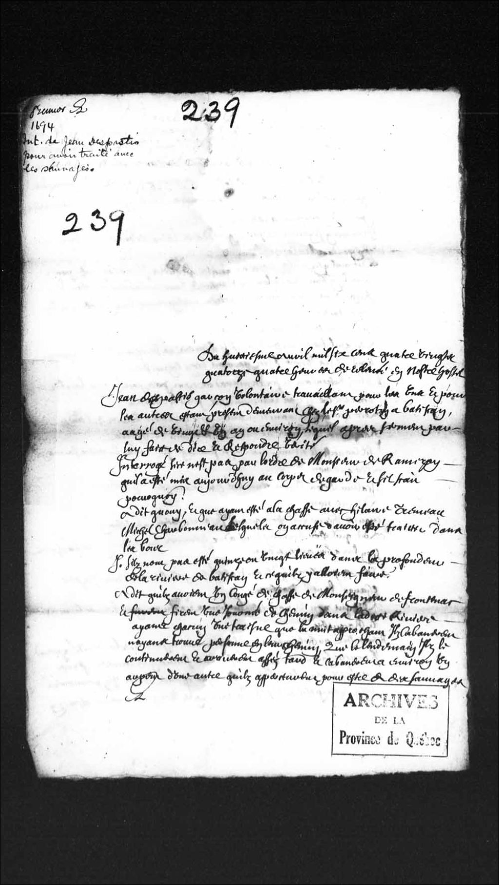 - Interrogatoire par Jean Lechasseur, lieutenant général civil et criminel de la Juridiction royale des Trois-Rivières, de Jean Despatis (Depatie), garçon volontaire, accusé d'avoir traité avec les Sauvages (Amérindiens) dans les bois en compagnie d'Hilaire Tremeau et de Michel Charbonneau, mis au corps de garde sur l'ordre de monsieur Ramezay
