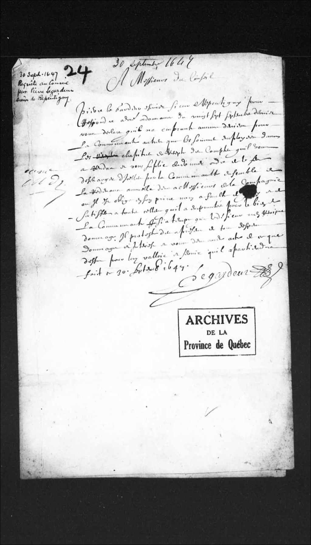 Déclaration de Pierre Legardeur, écuyer, sieur de Repentigny, en réponse à l'ordonnance du Conseil de Québec, du 27 septembre 1647, à l'effet qu'il n'a emprunté aucun deniers pour la communauté autres que les sommes employées dans les chapitres de recette du compte qu'il a rendu, 30 septembre 1647, Archives nationales à Québec, Collection Pièces judiciaires et notariales, (03Q,TL5,D24).