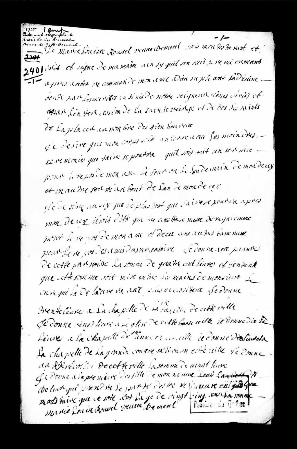 Testament olographe de Marie-Louise Roussel, veuve de Jean-Baptiste Demeules, 1er août 1735, Archives nationales à Québec, Collection Pièces judiciaires et notariales, (03Q,TL5,D2401).