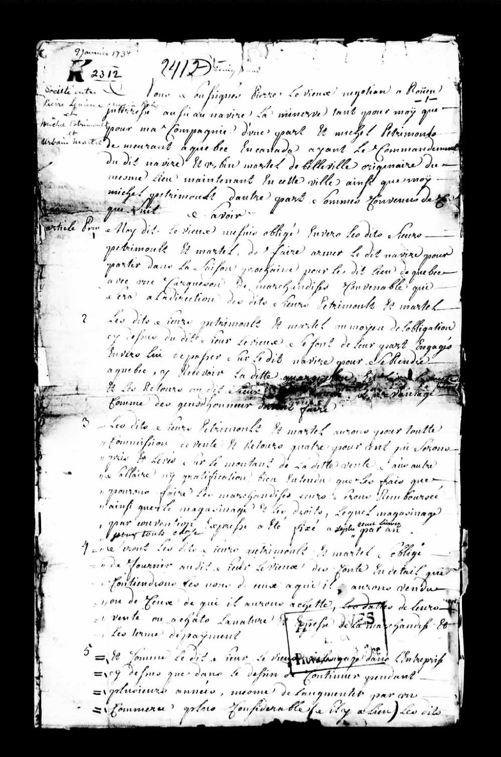 - Convention sous seing privé entre Pierre Levieux, négociant à Roüen, Michel Pétrimoulx, commandant du navire "La Minerve", demeurant à Québec, et Urbain Martel, sieur de Belleville, concernant le transport maritime de certaines marchandises