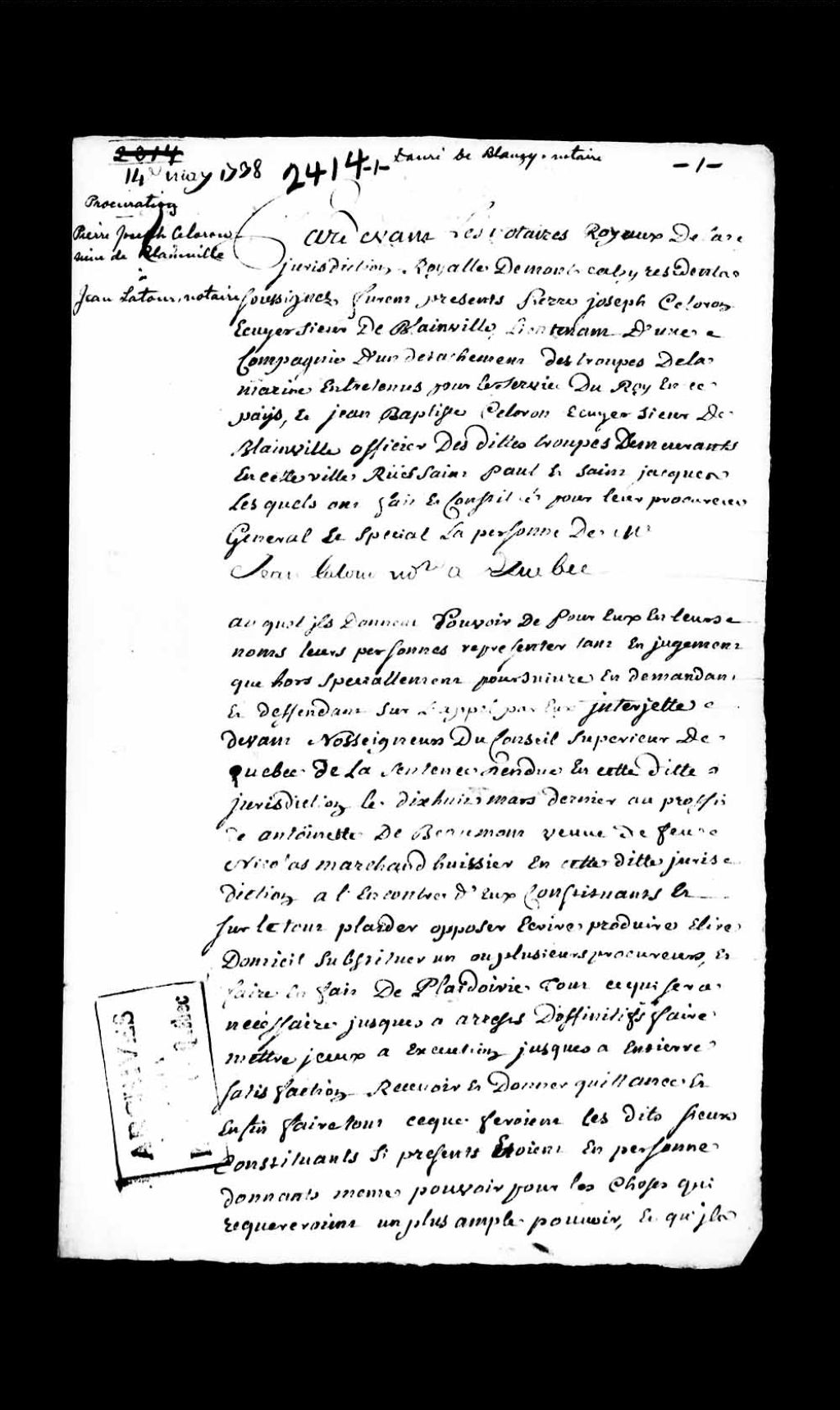 Procuration faite par Pierre-Joseph Céloron, écuyer et sieur de Blainville, lieutenant de compagnie d'un détachement des troupes de la Marine en garnison, et Jean-Baptiste Céloron, écuyer et sieur de Blainville, officier dans lesdites troupes, en faveur de Jean Latour, notaire de Québec, pour les représenter au Conseil Supérieur de Québec dans l'instance les opposant à Charlotte-Antoinette Beaumont, veuve de feu Nicolas Marchand, vivant huissier en ladite juridiction, 14 mai 1738, Archives nationales à Québec, Collection Pièces judiciaires et notariales, (03Q,TL5,D2414).