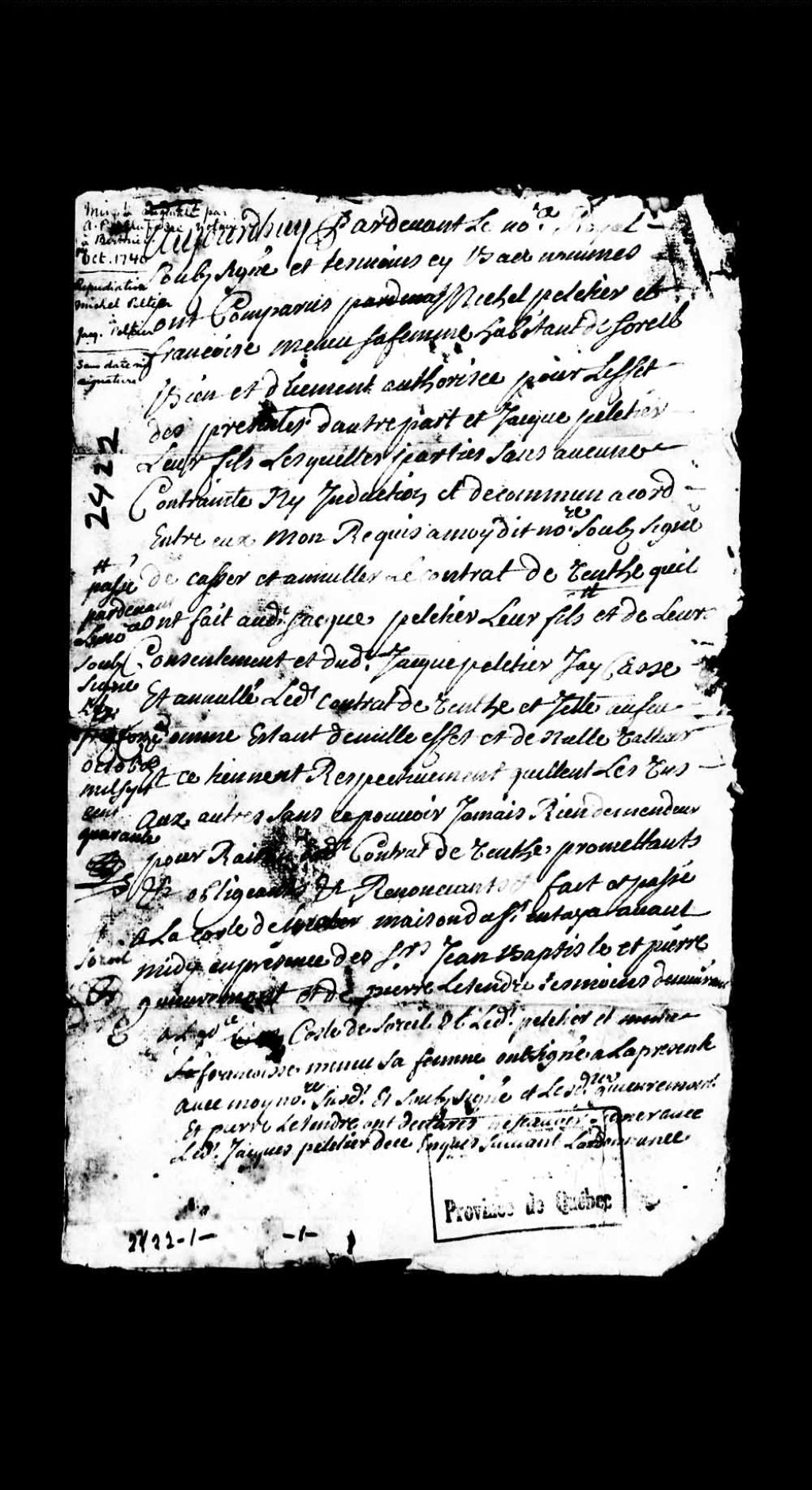 Répudiation par Michel Pelletier, habitant de Sorel et Françoise Meneux, sa femme, d'un contrat de vente conclut avec Jacques Pelletier, leur fils; ledit Jacques Pelletier souhaitant également l'annulation dudit contrat, 14 octobre 1740, Archives nationales à Québec, Collection Pièces judiciaires et notariales, (03Q,TL5,D2422).
