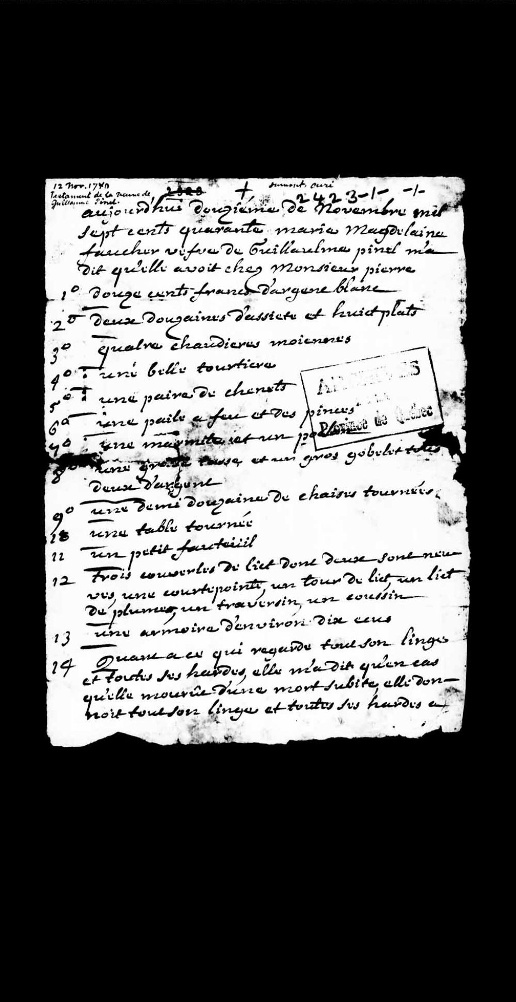 Mémoire de Marie-Madeleine Faucher, veuve de feu Guillaume Pinel, concernant les effets personnels laissés chez monsieur Pierre, 12 novembre 1740, Archives nationales à Québec, Collection Pièces judiciaires et notariales, (03Q,TL5,D2423).