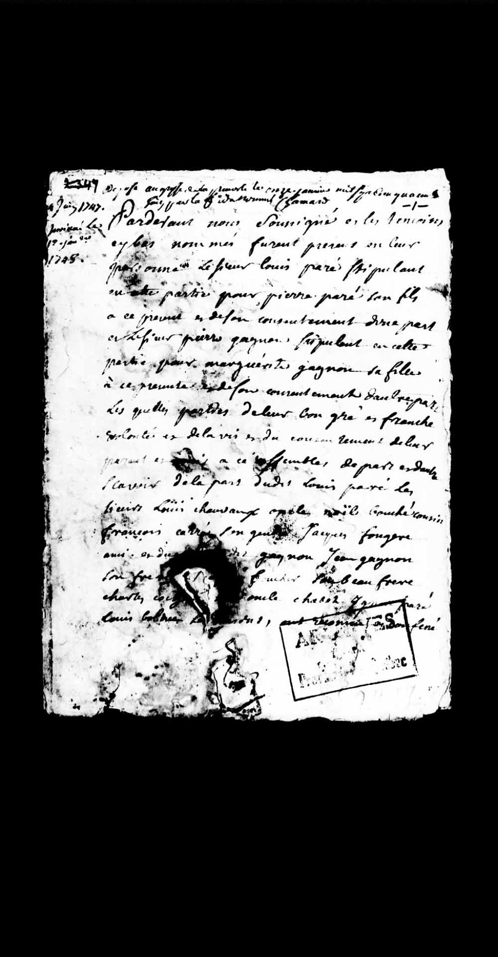 Contrat de mariage entre Pierre Paré, fils de Louis Paré; et Marguerite Gagnon, fille de Pierre Gagnon