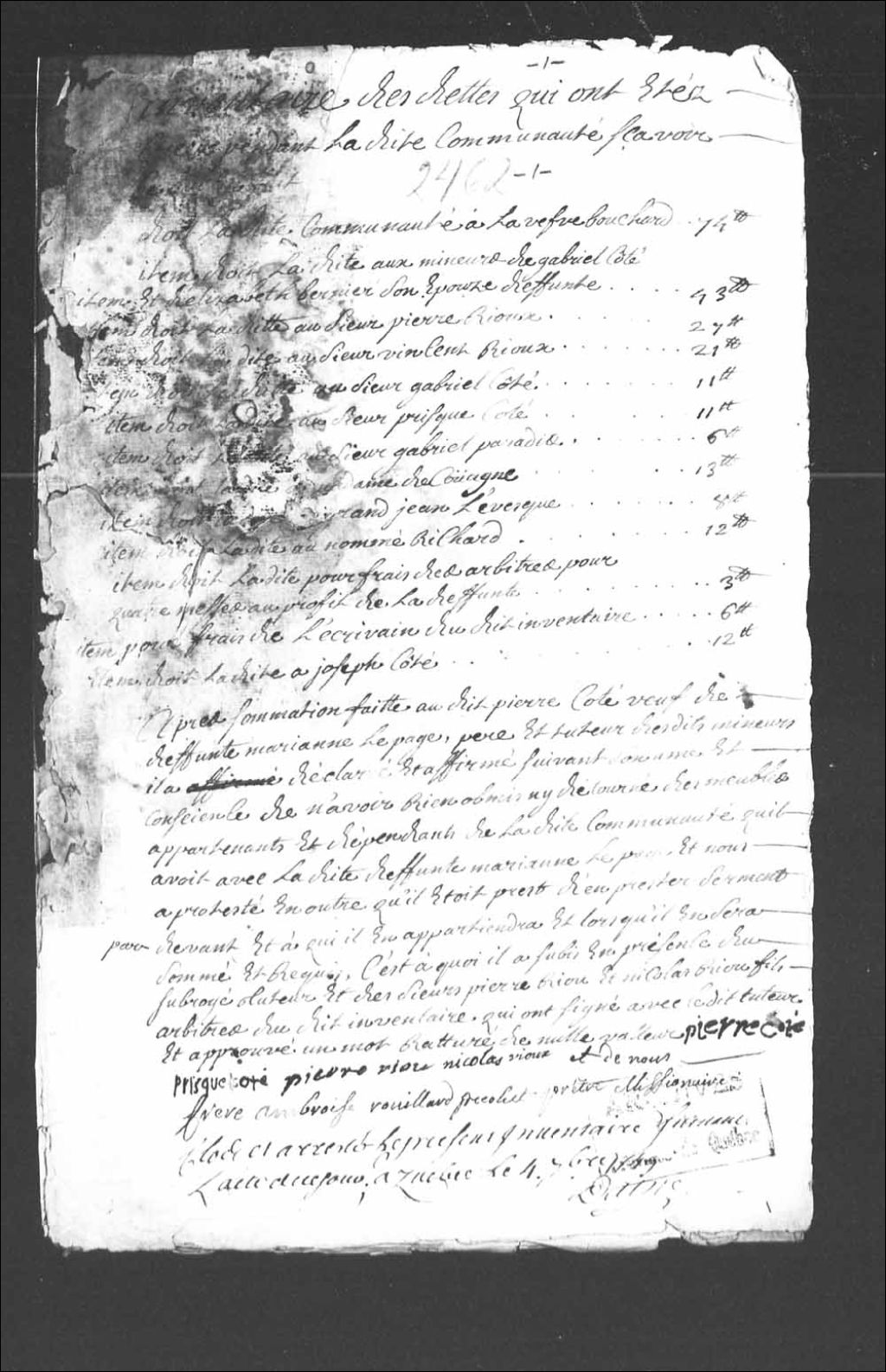 Mémoire des dettes et inventaire des biens de la communauté entre Pierre Côté et feue Marie-Anne Lepage