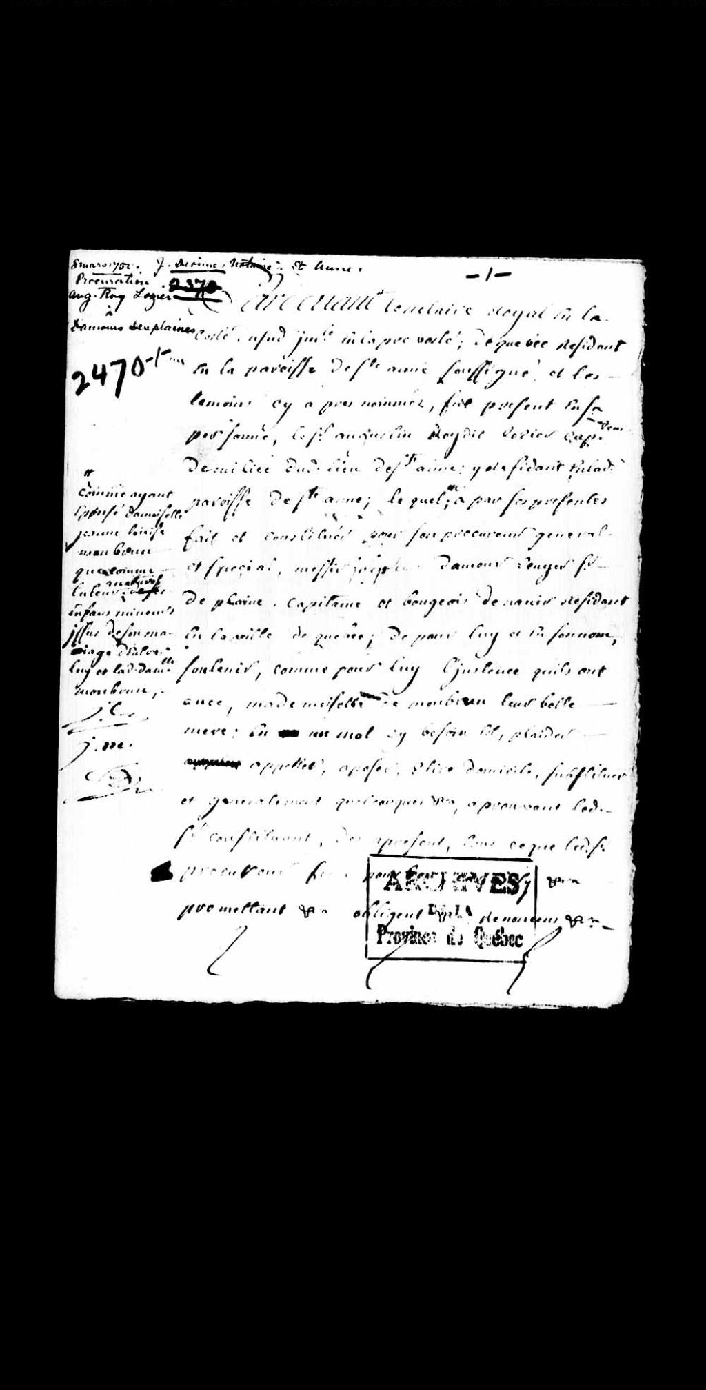 Procuration par Augustin Roy dit Lauzier, capitaine de milice, demeurant en la paroisse de Sainte-Anne, à Monsieur Joseph Damours, écuyer et sieur de Plaines, capitaine et bourgeois de navire, résidant en la ville de Québec, 8 mars 1750, Archives nationales à Québec, Collection Pièces judiciaires et notariales, (03Q,TL5,D2470).