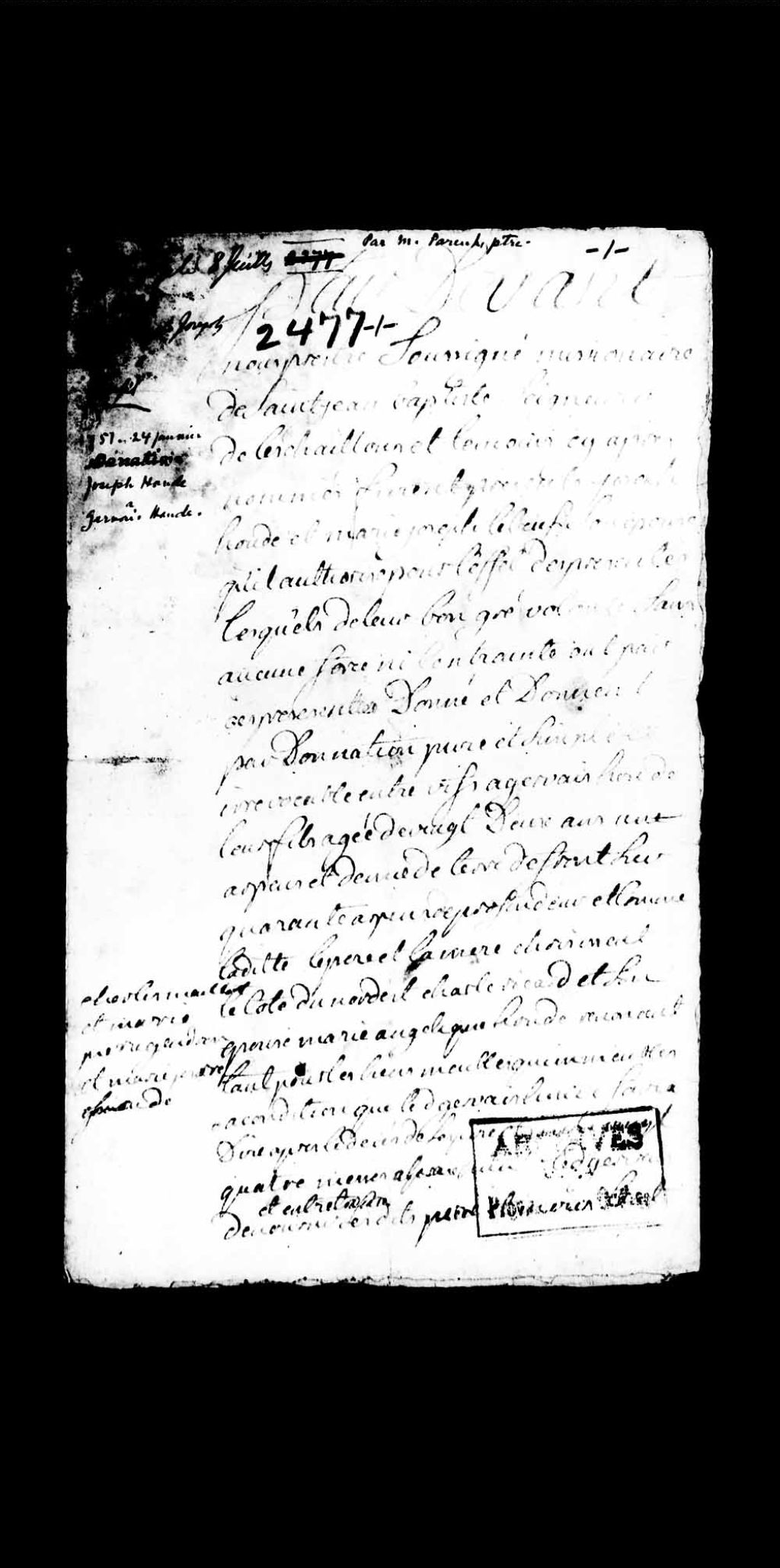 Donation entre vifs d'un arpent et demi de terre, par Joseph Houde et Marie-Josèphe Leboeuf, son épouse; à Gervais Houde, leur fils âgé de 22 ans, 24 juin 1751, Archives nationales à Québec, Collection Pièces judiciaires et notariales, (03Q,TL5,D2477).