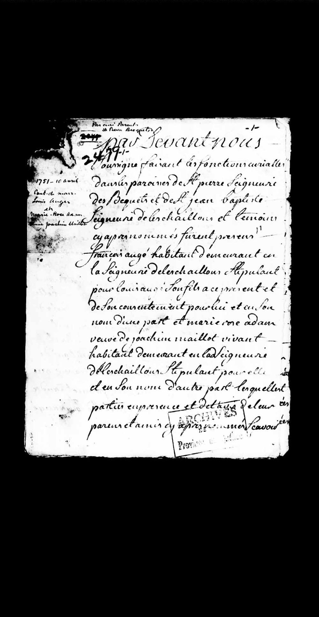 Contrat de mariage entre Louis Auger, fils de François Auger, habitant demeurant en la seigneurie desChaillons; et Marie-Rose Adam, veuve de Joachim Maillot, vivant habitant demeurant en ladite seigneurie, 10 avril 1751, Archives nationales à Québec, Collection Pièces judiciaires et notariales, (03Q,TL5,D2479).