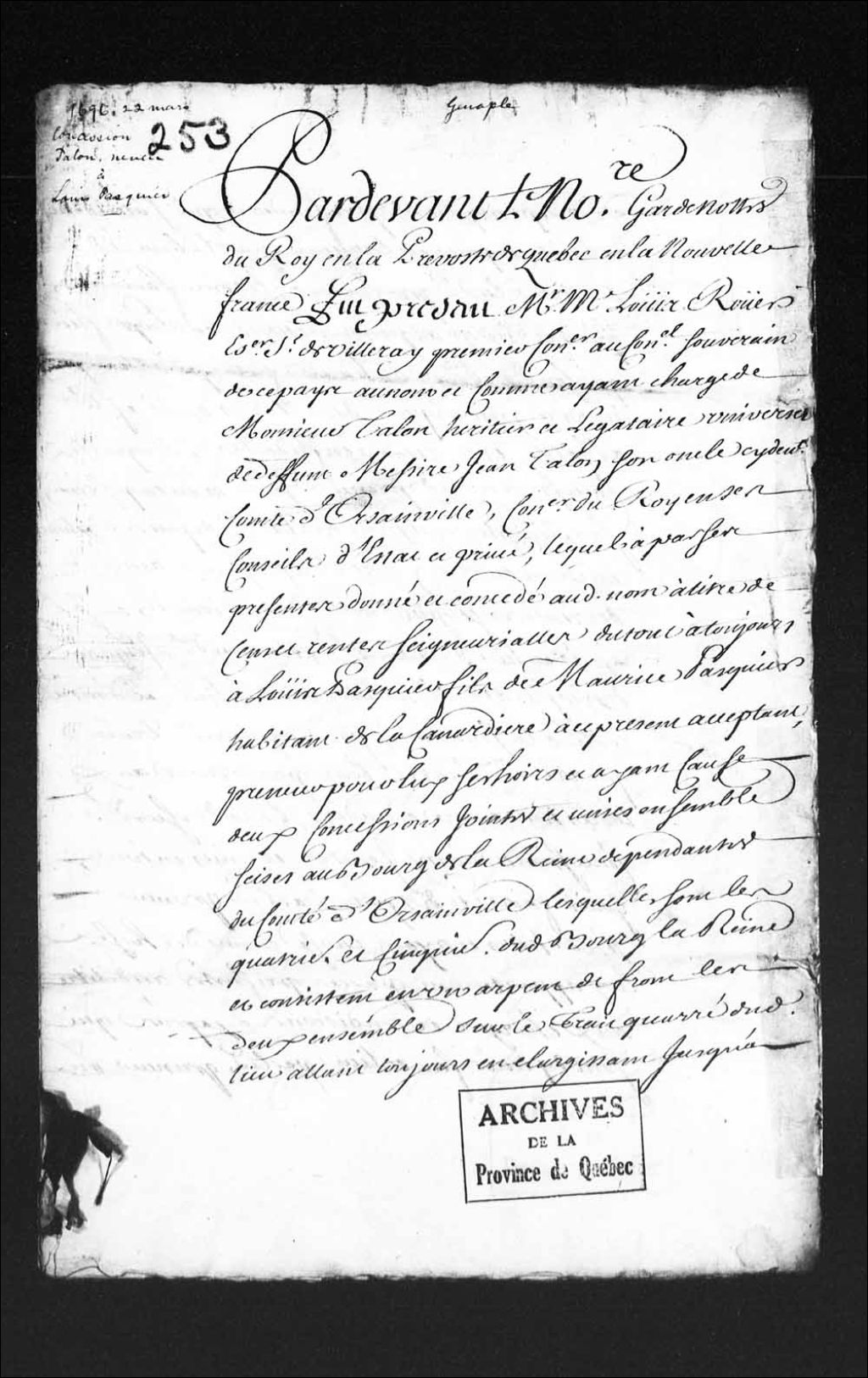 Concession par Louis Rouer de Villeray, premier conseiller au Conseil souverain de Québec, au nom et comme ayant charge de monsieur Talon, héritier et légataire universel de feu messire Jean Talon, anciennement intendant de la Nouvelle-France, son oncle, d'une terre à titre de cens et de rentes, située au bourg de la Reine dépendant du comté d'Orsainville, à Louis Paquet (Pasquier), fils de Maurice Paquet (Pasquier), habitant de la Canardière, 22 mars 1696, Archives nationales à Québec, Collection Pièces judiciaires et notariales, (03Q,TL5,D253).