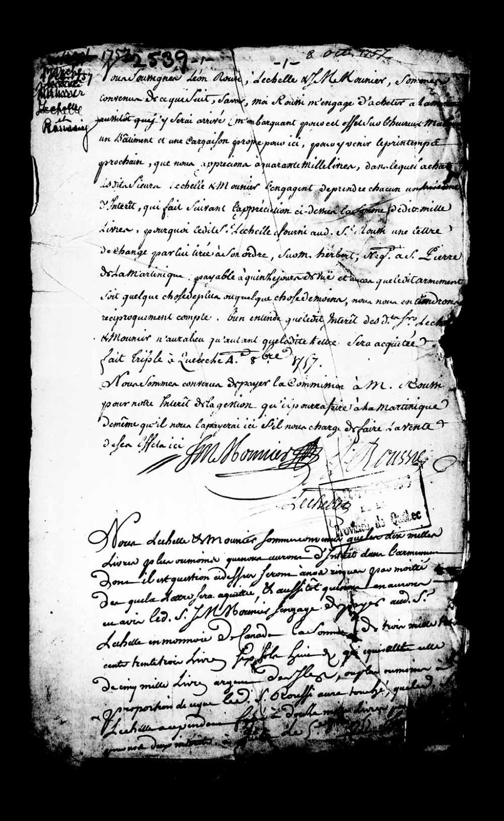 Marché et conventions entre Léon Roussi (Roussy), Lechelle et J.-M. Mounier afin que Roussi achète à la Martinique un bateau et une cargaison pour une valeur de 40 000 livres et les ramène au Canada le printemps suivant, 4 octobre 1757, Archives nationales à Québec, Collection Pièces judiciaires et notariales, (03Q,TL5,D2539).