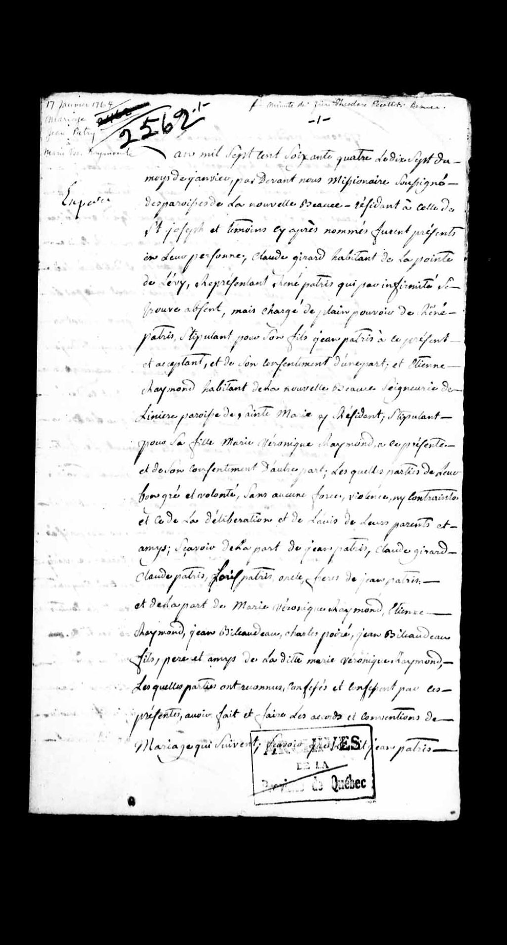 - Contrat de mariage de Jean Patry, fils de Jean Patry et de Marie-Véronique Raymond, fille de Étienne Raymond, habitant de la Nouvelle-Beauce, seigneurie de Liniere et résidant en la paroisse de Sainte-Marie