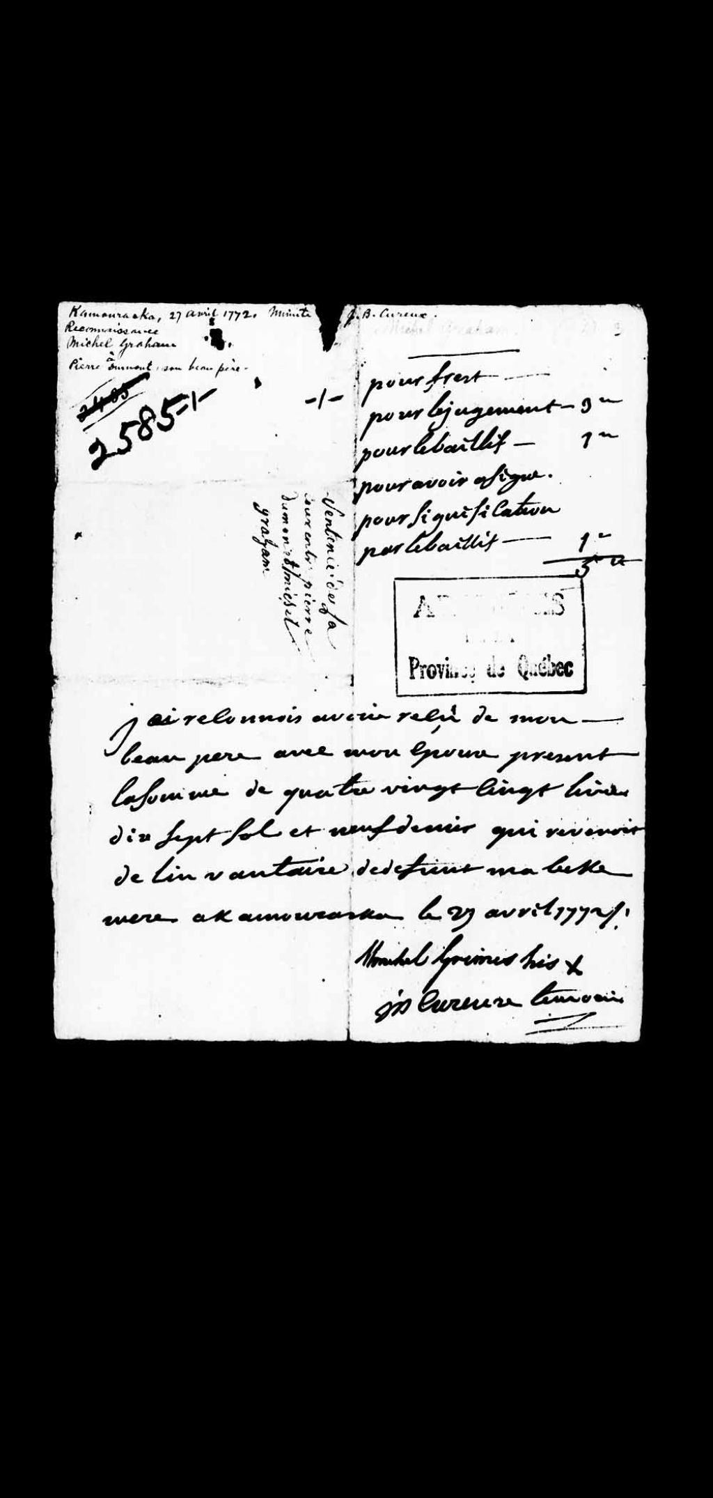 Sentence de la Cour de tournée à Kamouraska entre Michel Graham (Grimes, Greinde, Grand), époux de Marguerite Dumont, et Pierre Dumont, tous de Kamouraska, concernant la gestion faite par Pierre Dumont des biens échus à Marguerite Dumont par le décès de sa mère et quittance donnée par Michel Graham et son épouse à Pierre Dumont pour la somme de 85 livres 17 sols 9 deniers qui leur revenait suivant l'inventaire des biens de leur mère et belle-mère, 25 mars 1772 - 27 avril 1772, Archives nationales à Québec, Collection Pièces judiciaires et notariales, (03Q,TL5,D2585).