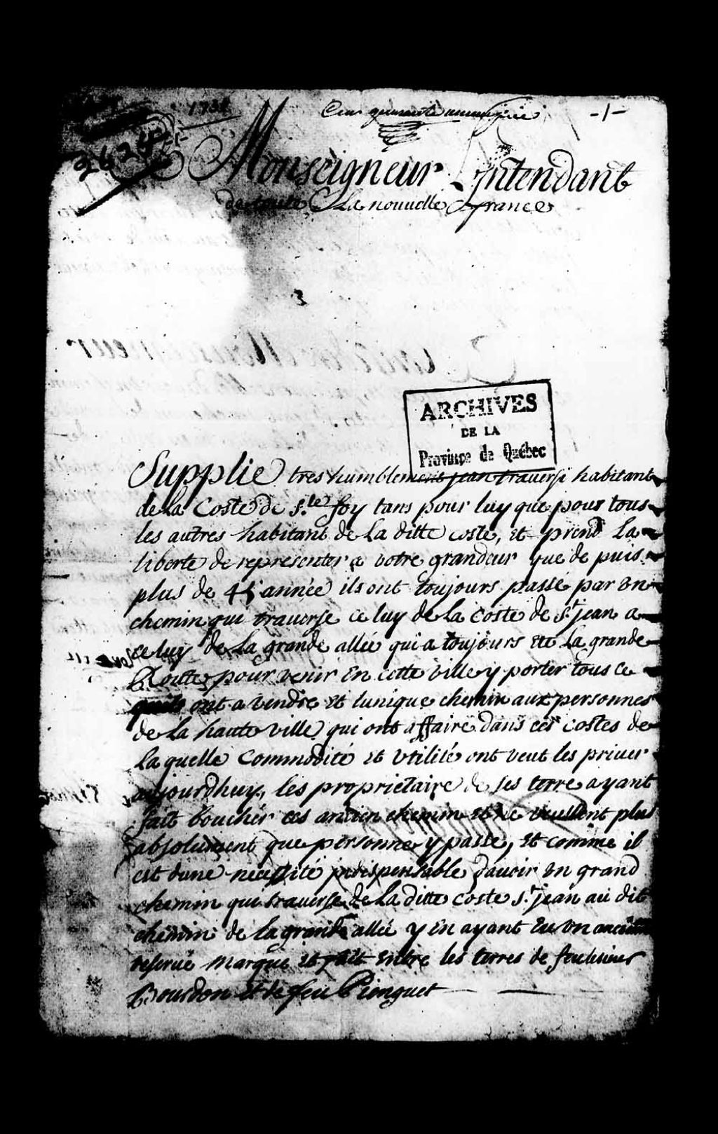 Requête à monseigneur l'intendant Hocquart, de Jean Traversi (Langlois dit Traversy), habitant de la côte de Sainte-Foy, tant pour lui que pour tous les habitants de la côte, remontrant que depuis 45 ans ils se servent d'un chemin qui traverse de la côte Saint-Jean à la Grande-Allée, dont on veut maintenant les priver