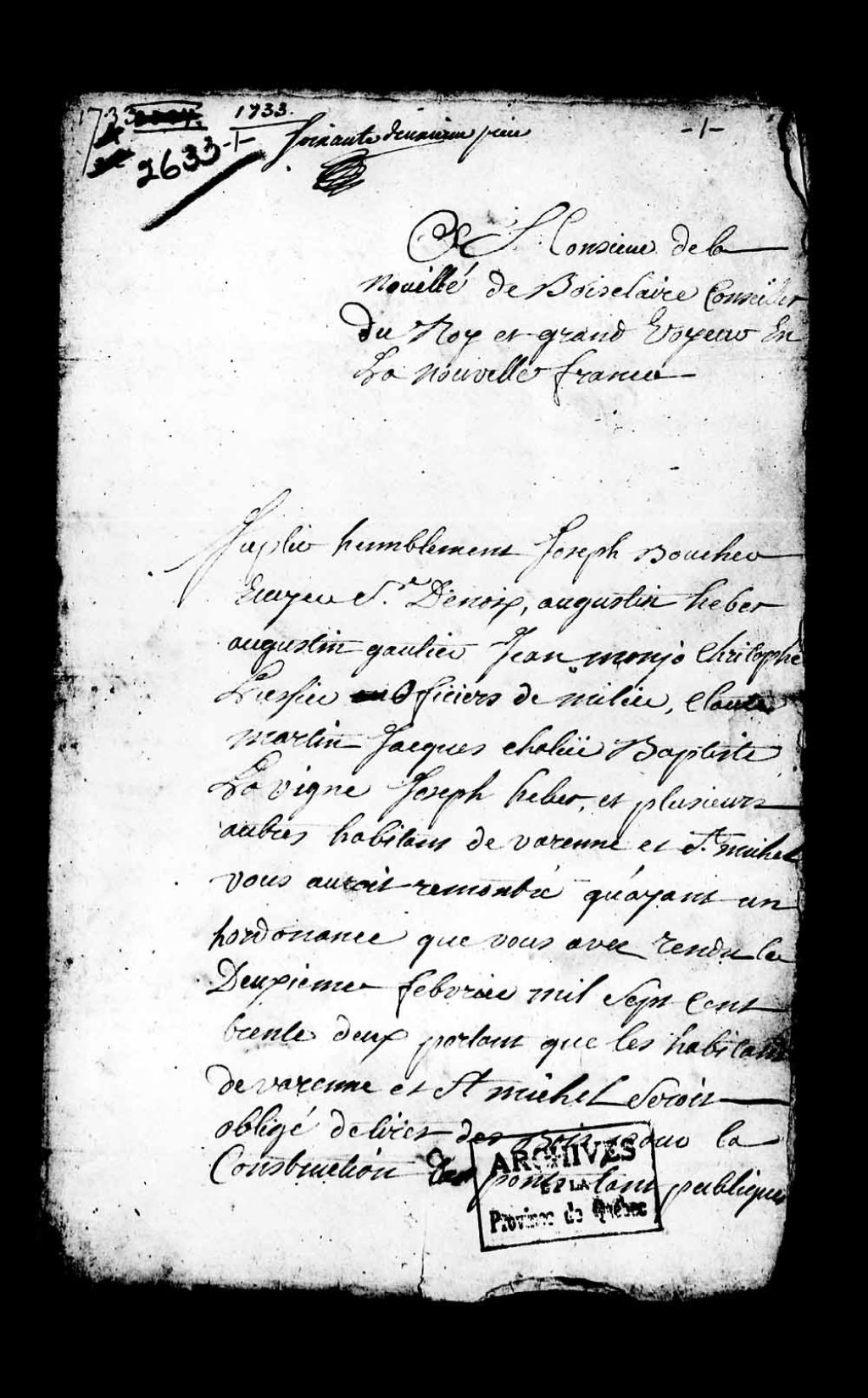 Requête de Joseph Boucher, sieur de Noix, Augustin Hébert, Augustin Gauthier, Claude Martin et autres habitants de Varennes et Saint-Michel, se plaignant de la non exécution d'une ordonnance du grand voyer, datant du 2 février 1732, portant que les habitants devaient tirer du bois pour la construction des ponts qui se trouvent dans la paroisse, 23 juin 1733, Archives nationales à Québec, Collection Pièces judiciaires et notariales, (03Q,TL5,D2633).
